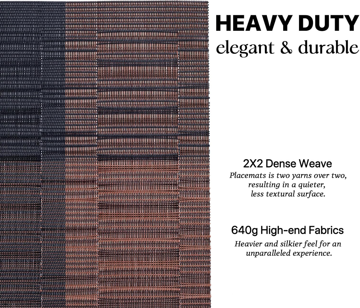 - HEAVY-DUTY:We uses the German-imported higher grammage vinyl material (Specialty PVC)than other placemats on the market,plus the precise,dense weave craftsmanship to give the woven placemats a thicker feel and make the place mats long-lasting.