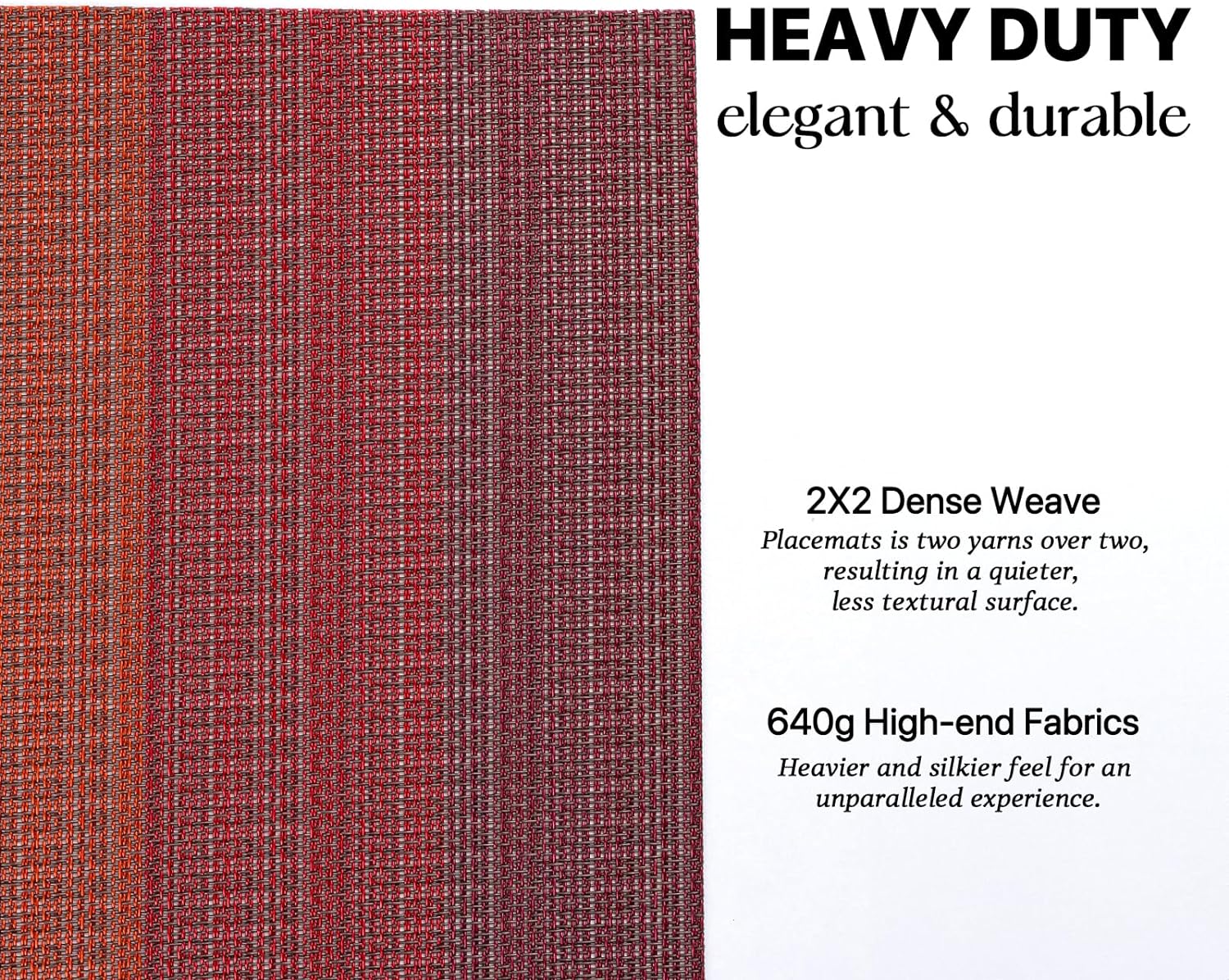 - HEAVY-DUTY:We uses the German-imported higher grammage vinyl material (Specialty PVC)than other placemats on the market,plus the precise,dense weave craftsmanship to give the woven placemats a thicker feel and make the place mats long-lasting.