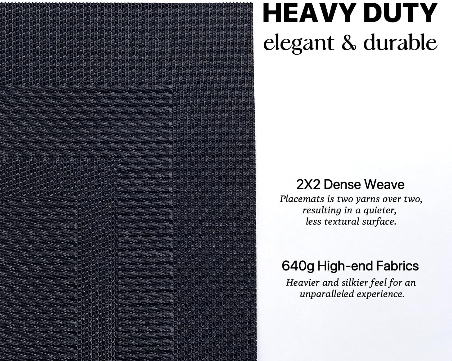 - HEAVY-DUTY:We uses the German-imported higher grammage vinyl material (Specialty PVC)than other placemats on the market,plus the precise,dense weave craftsmanship to give the woven placemats a thicker feel and make the place mats long-lasting.