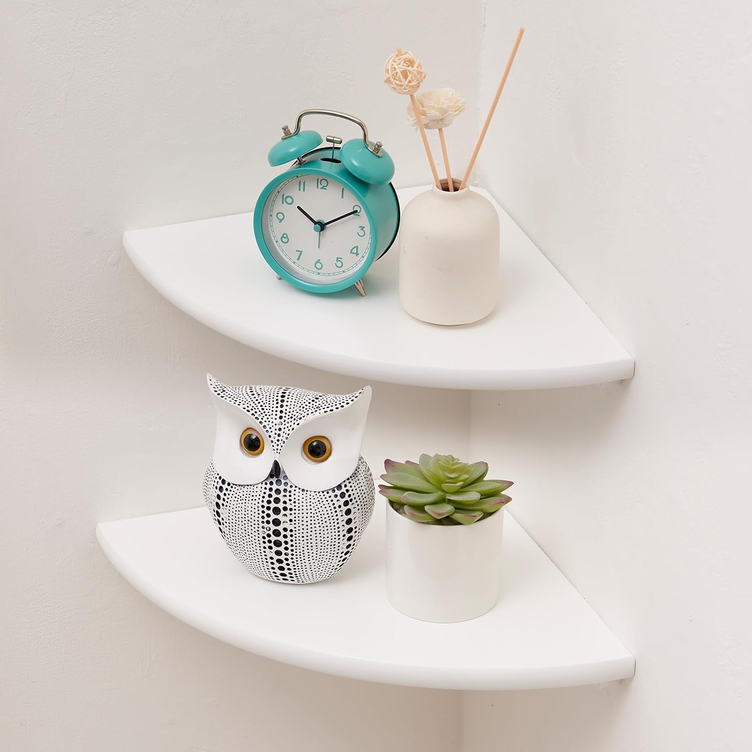 Corner Shelf, White Floating Corner Shelf, Set of 2 7inch Solid Oak Wood Corner Wall Shelves, Round End Wall Mount Display Shelf with Wire Hole for Small Plant for Bedroom Kitchen, Living Room