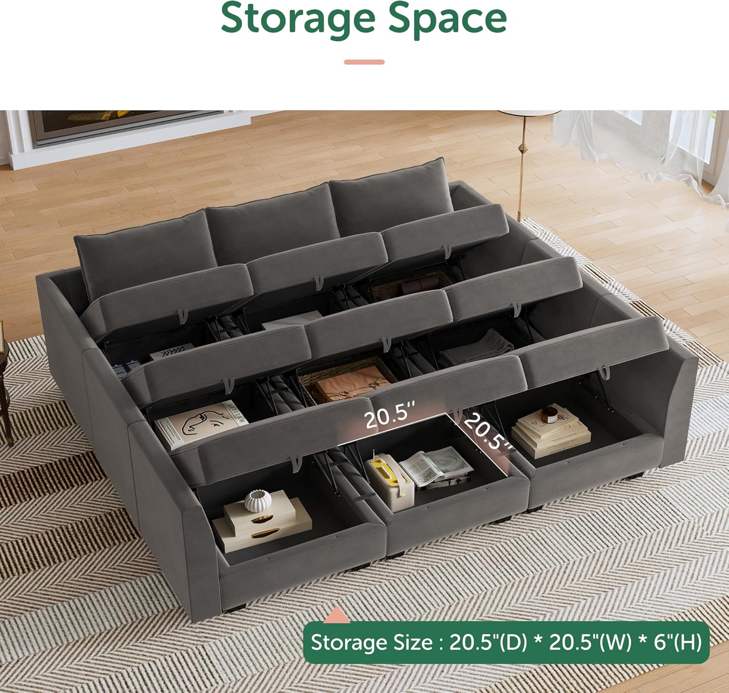 - Hidden Storage Space:The modular sofa has a hidden storage space under each seat for toys, blankets or other things that you want to store. You just need to pull the strap and lift the cushion lid to open it