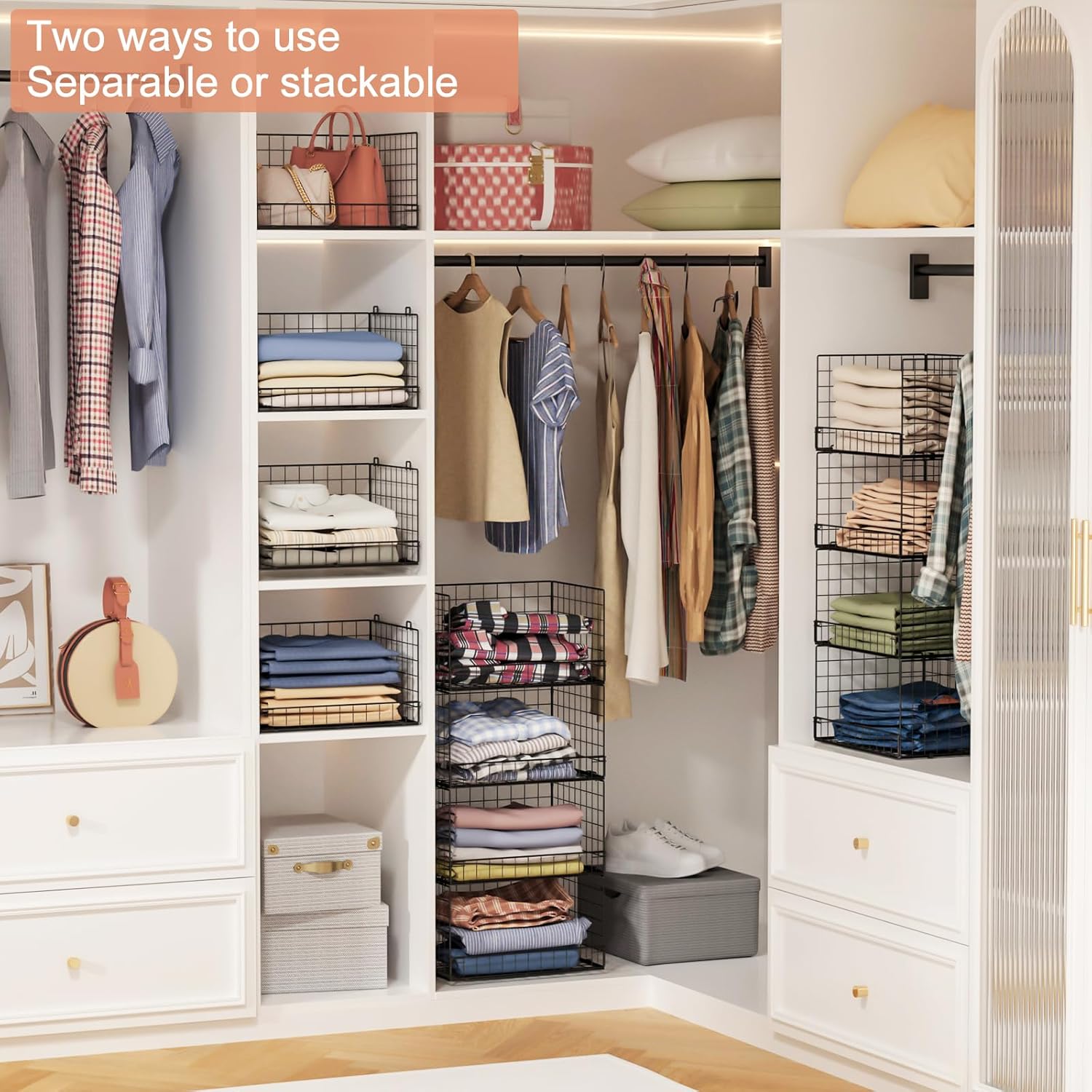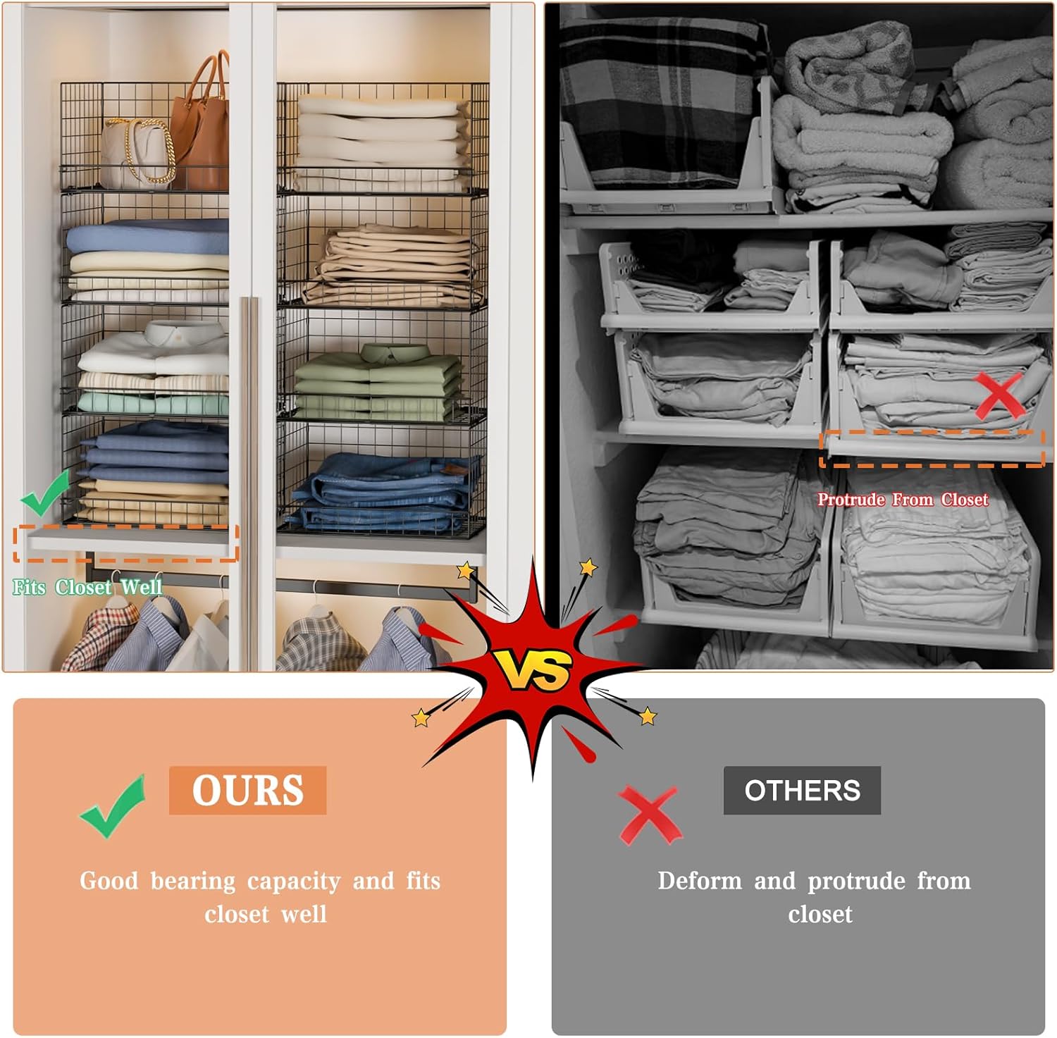 - ใStackabe and FoldableใThese collapsible closet shelves organizer are stackable and foldable.And can fold them to put in a corner without taking up space.You can stack multiple units together or use only one to meet your different needs.