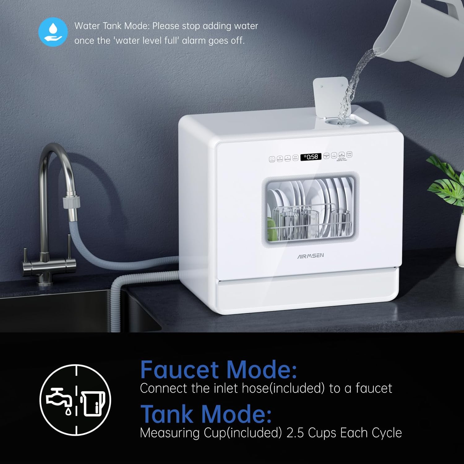 - Easy Setup: No installation needed! The A01 countertop dishwasher comes with a 5L water tank for flexible placement. Alternatively, connect it directly to your faucet using the included inlet hose.