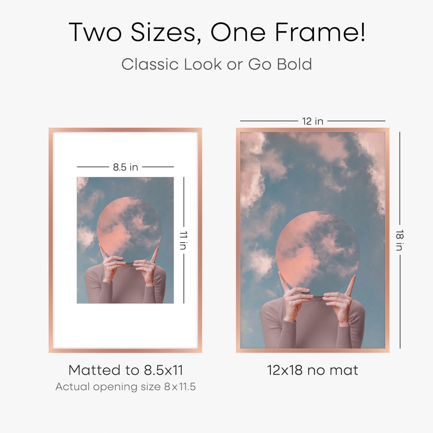 Homeforia 12x18 Picture Frame Rose Gold, High End Metal 12x18 Poster Frames with Mat 8.5x11 in Photo, 12 x 18 Rose Gold Frame Matted to 8.5 by 11 Print, 18x12 Frame, Tempered Glass, Wall Kit, Set of 1