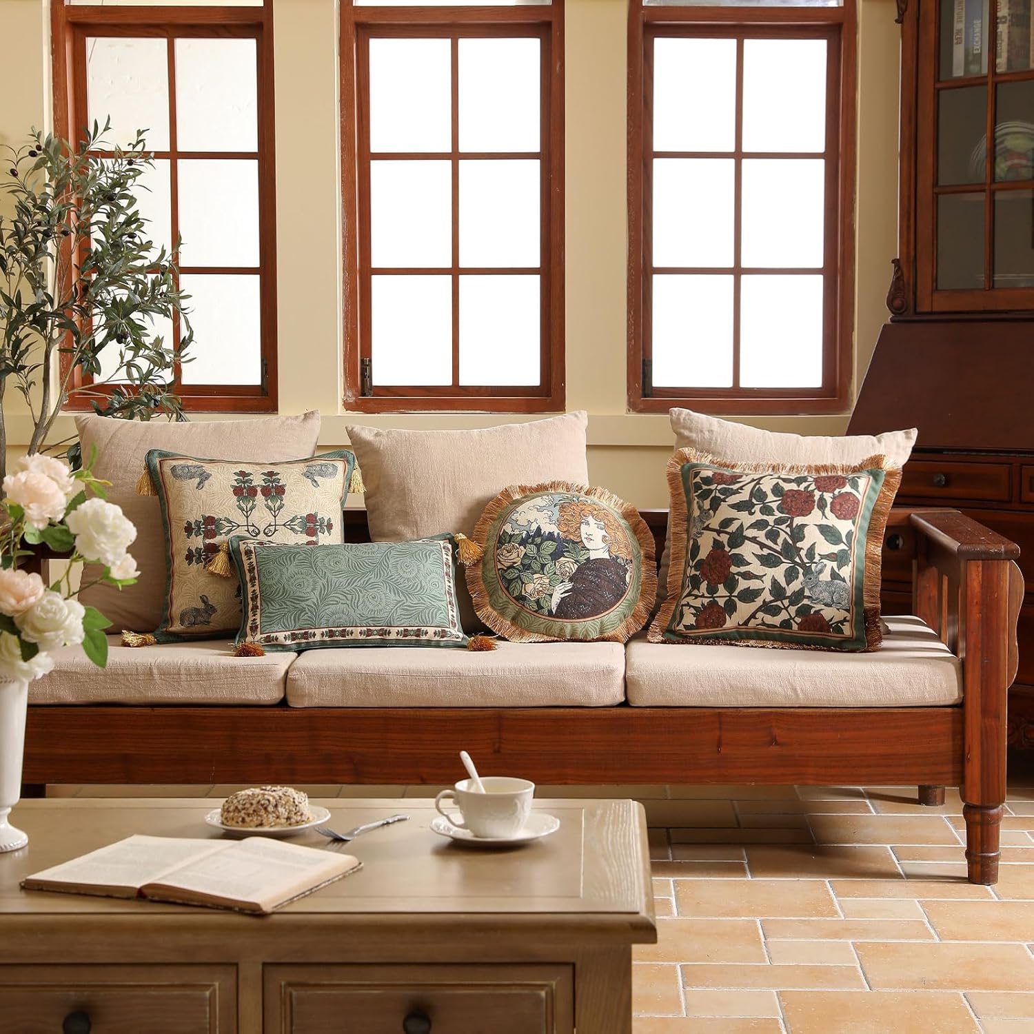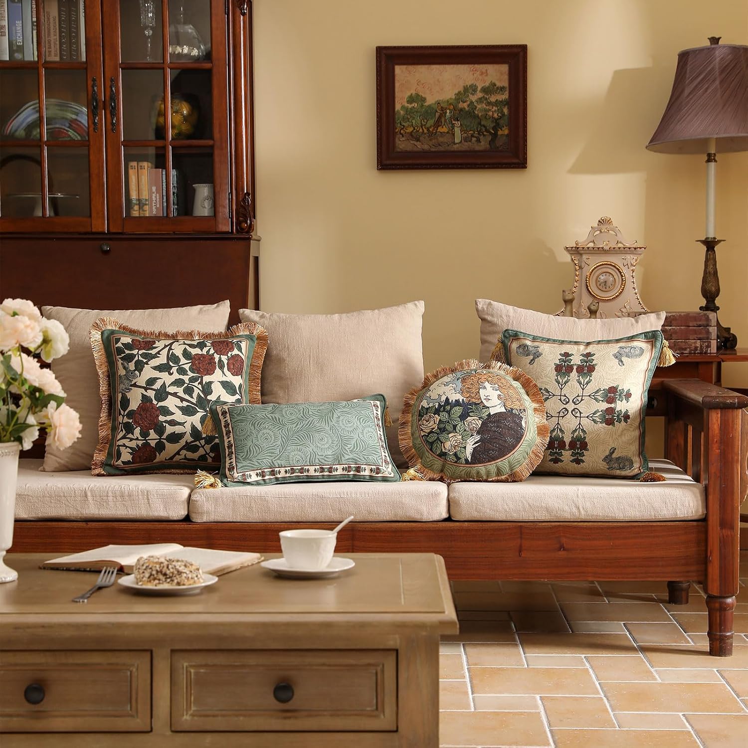 patdrea Designer Throw Pillow Covers Set of 4,French Elegant Green Linen with Rose Collection Pattern Pillow Covers,Decorative Lumbar Square Round Pillowcases Cushion for Bed Living Room Outdoor
