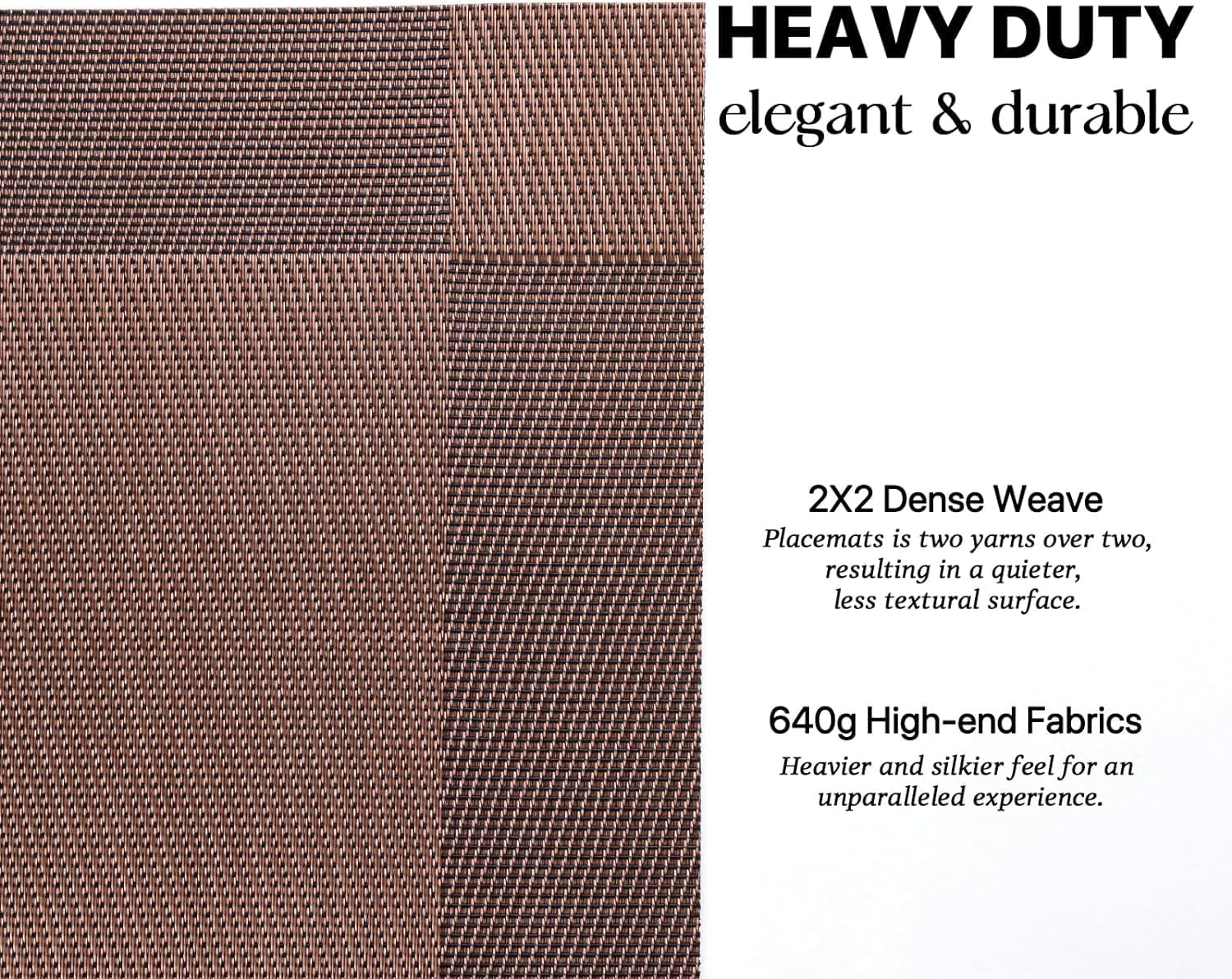 - HEAVY-DUTY:We uses the German-imported higher grammage vinyl material (Specialty PVC)than other placemats on the market,plus the precise,dense weave craftsmanship to give the woven placemats a thicker feel and make the place mats long-lasting.