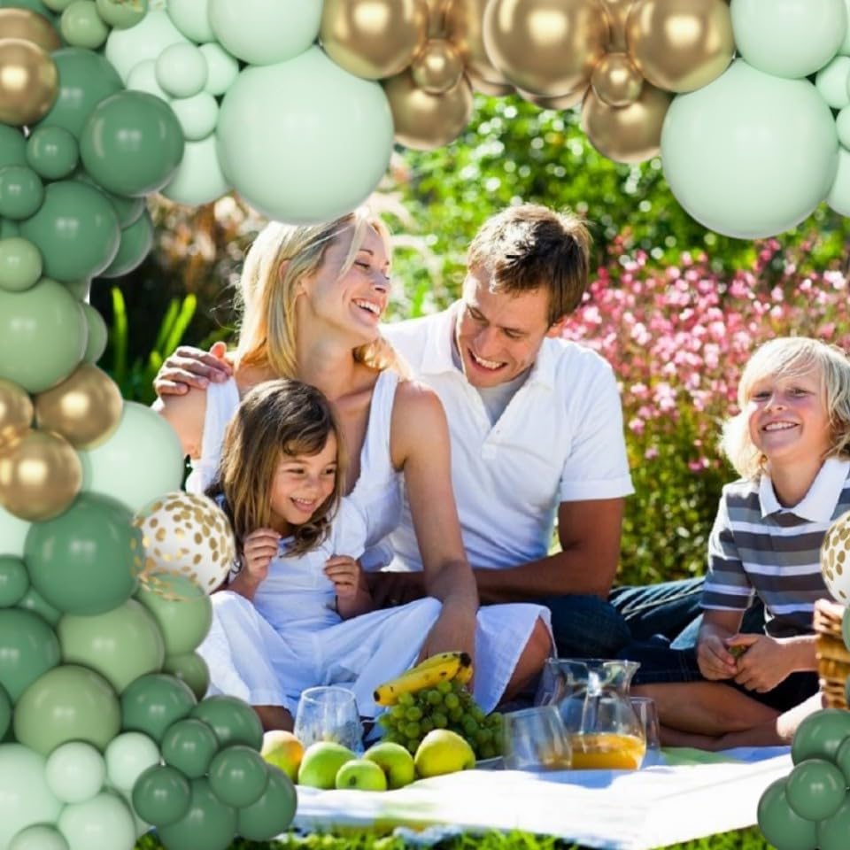 - Sufficient Quantity of Green Balloons: The sage green balloon garland includes 18โ sage green/olive green/pastel green balloons(3 pcs), 12โ sage green/olive green/pastel green/metallic gold/confetti gold balloons(25 pcs), 10โ sage green/olive gree/pastel green/metallic gold balloons(50 pcs), 5โ sage green/olive green/pastel green/metallic gold balloons (65 pcs) and 10 pcs balloon tools(balloon arch strips, tying tool, 100 glue points, ribbon, flower balloon clip, hook)