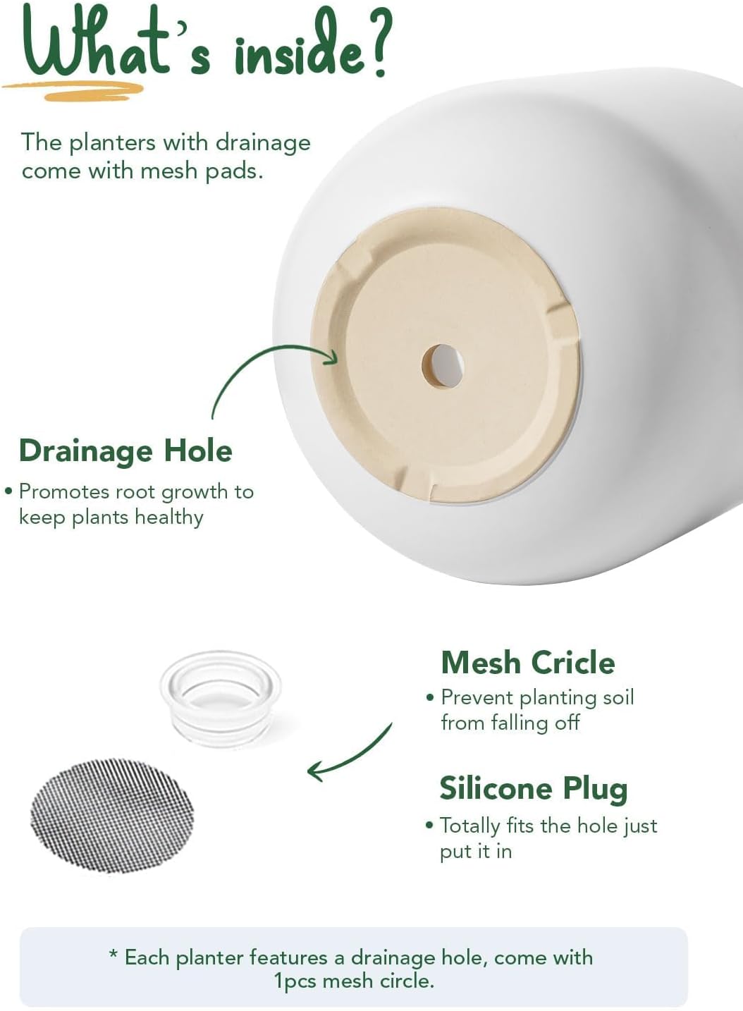 - Drainage Hole & Accessories: Each indoor planter pot features carefully designed drainage hole to maintain optimal soil moisture; The inclusion of silicone plugs and mesh pads provides added convenience, giving you flexibility in how you care for your plants
