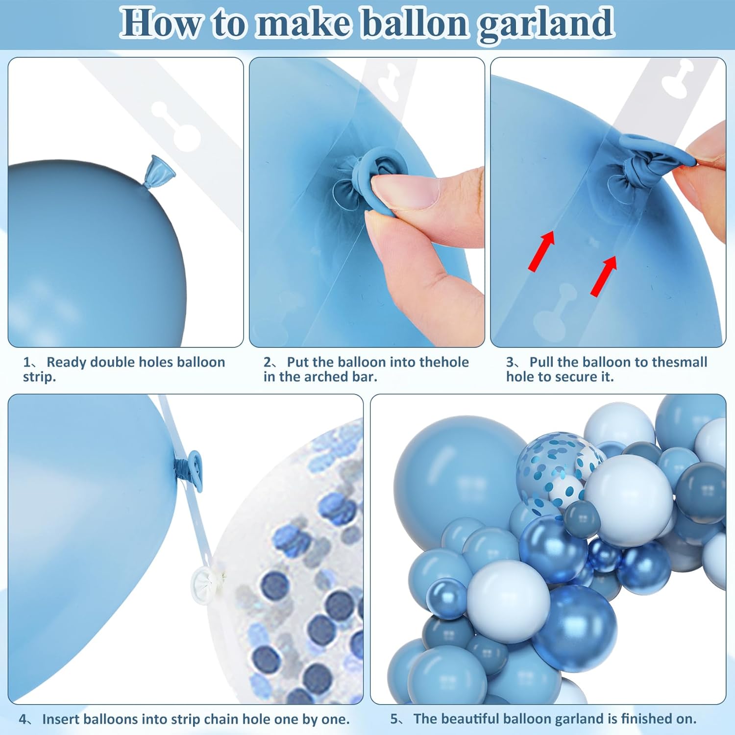 - Sufficient Quantity of Blue Balloons: The blue balloon arch kit includes 18β ocean blue/light blue/pastel blue balloons(3 pcs), 12β ocean blue/light blue/pastel blue/metallic blue/confetti blue balloons(25 pcs), 10β ocean blue/light blue/pastel blue/metallic blue balloons (50 pcs), 5β ocean blue/light blue/pastel blue/metallic blue balloons (65 pcs) and 10 pcs balloon tools(balloon arch strips, tying tool, 100 glue points, ribbon, flower balloon clip, hook)