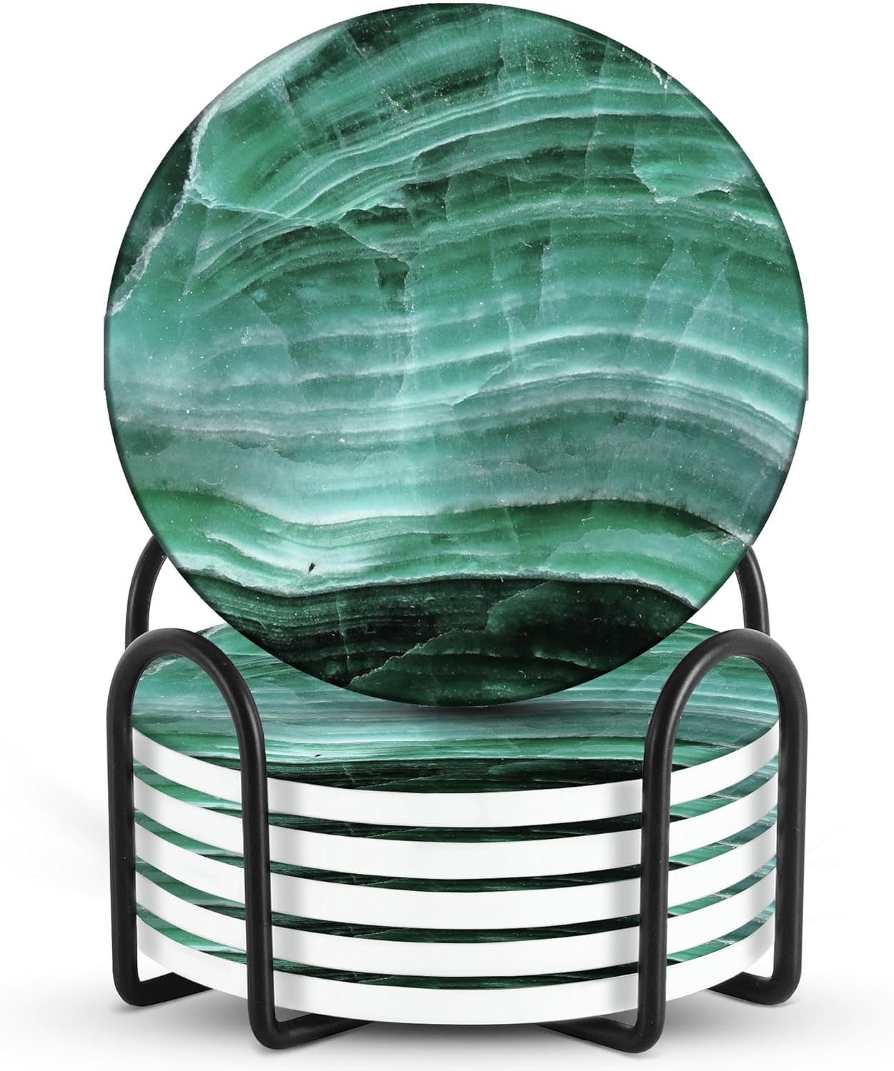 Emerson Coasters for Drinks Absorbent – Dining Table Set of 6 with Holder, 100% Ceramic Wooden Tabletop Protection Marble Style - Non-Slip & Cork Bottom - Heavy Duty (Nova)