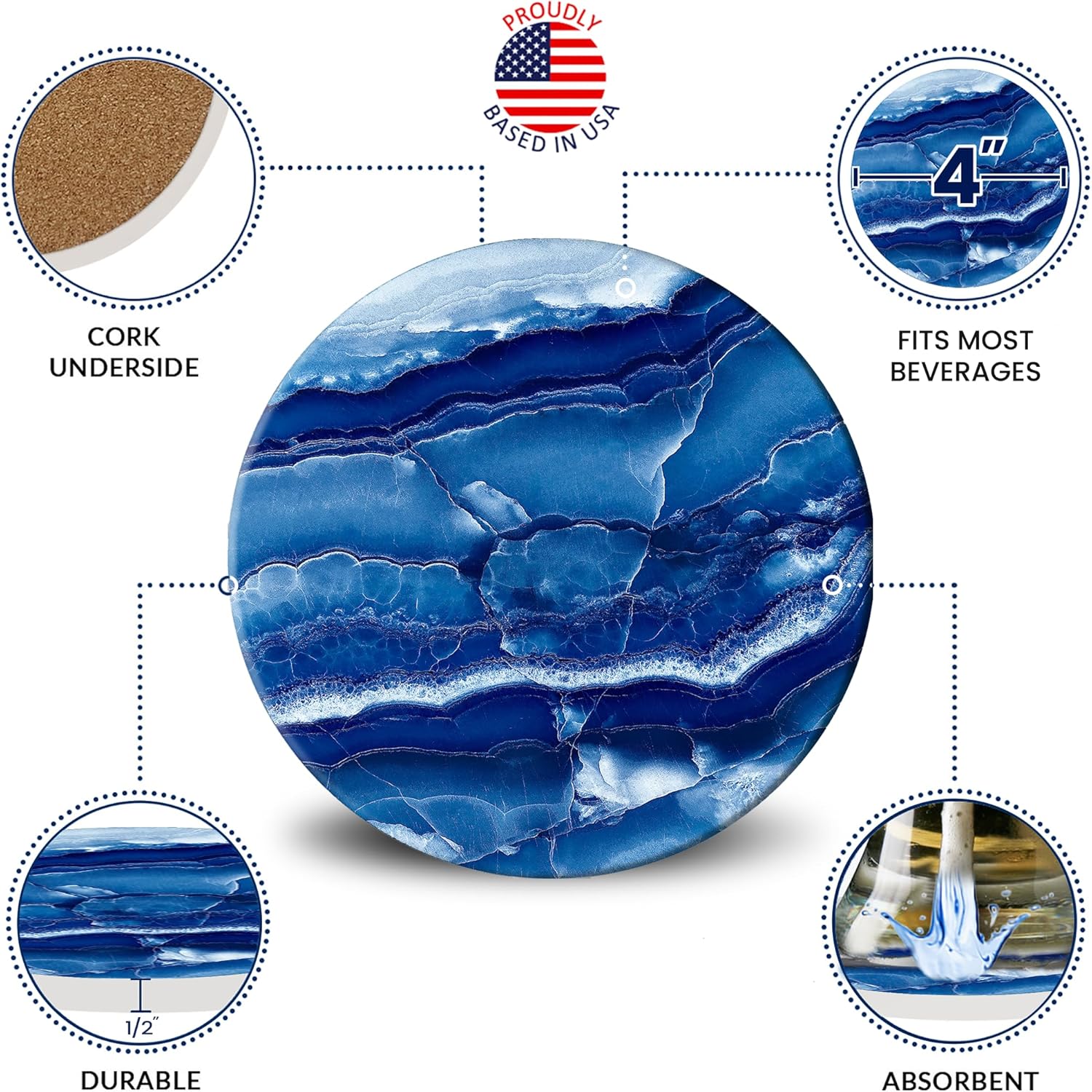 Emerson Coasters for Drinks Absorbent – Dining Table Set of 6 with Holder, 100% Ceramic Wooden Tabletop Protection Marble Style - Non Slip & Cork Bottom - Heavy Duty (Blue Onyx)