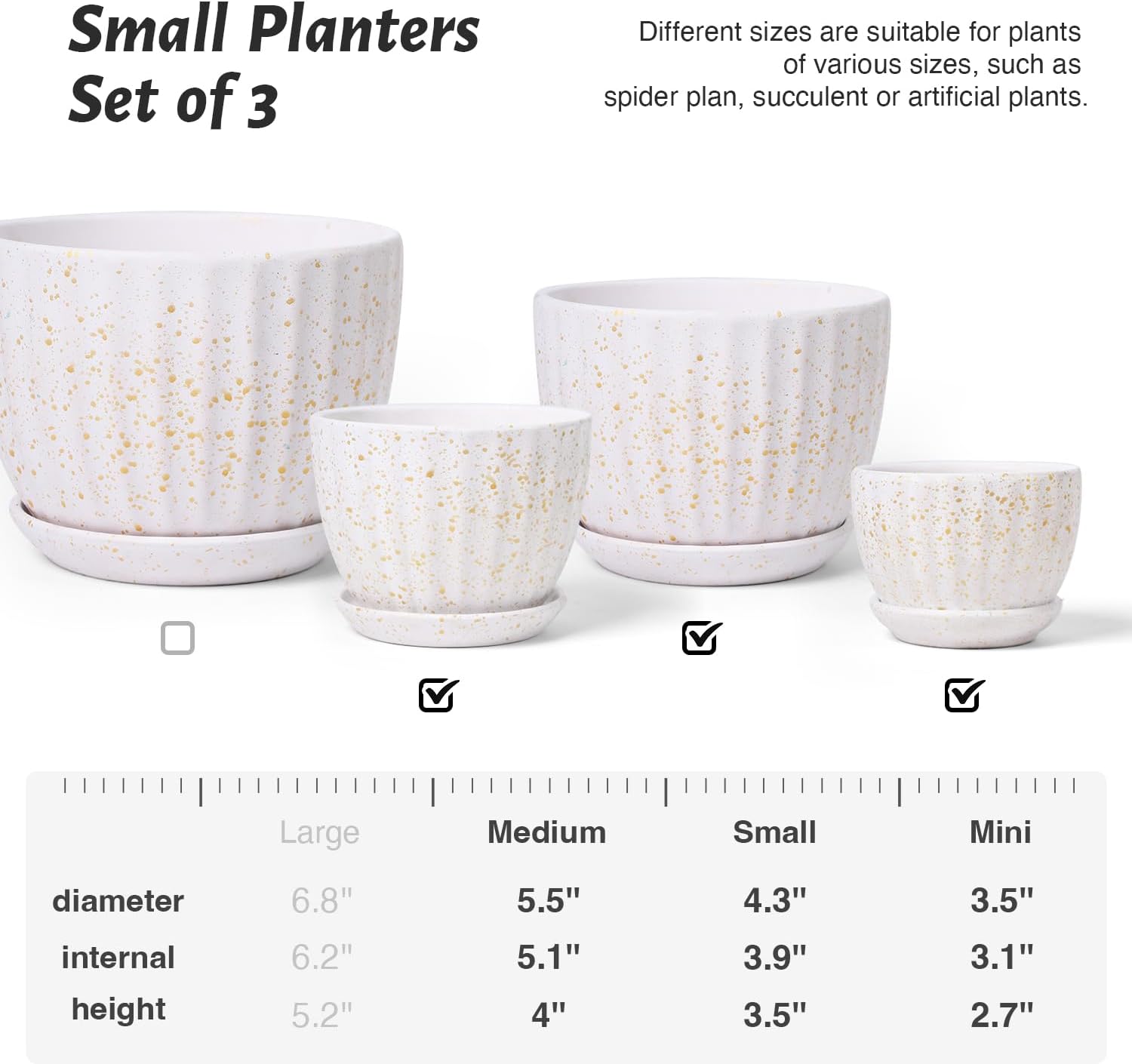 - SMALL PLANTER SET: These garden plant pots are made of ceramic and come in three sizes: Medium width is 5.5 inches (14 cm), Small width is 4.3 (11 cm) inches, and nimi width is 3.3 inches (9 cm). They are fired at high temperature, so they are durable and lightweight.