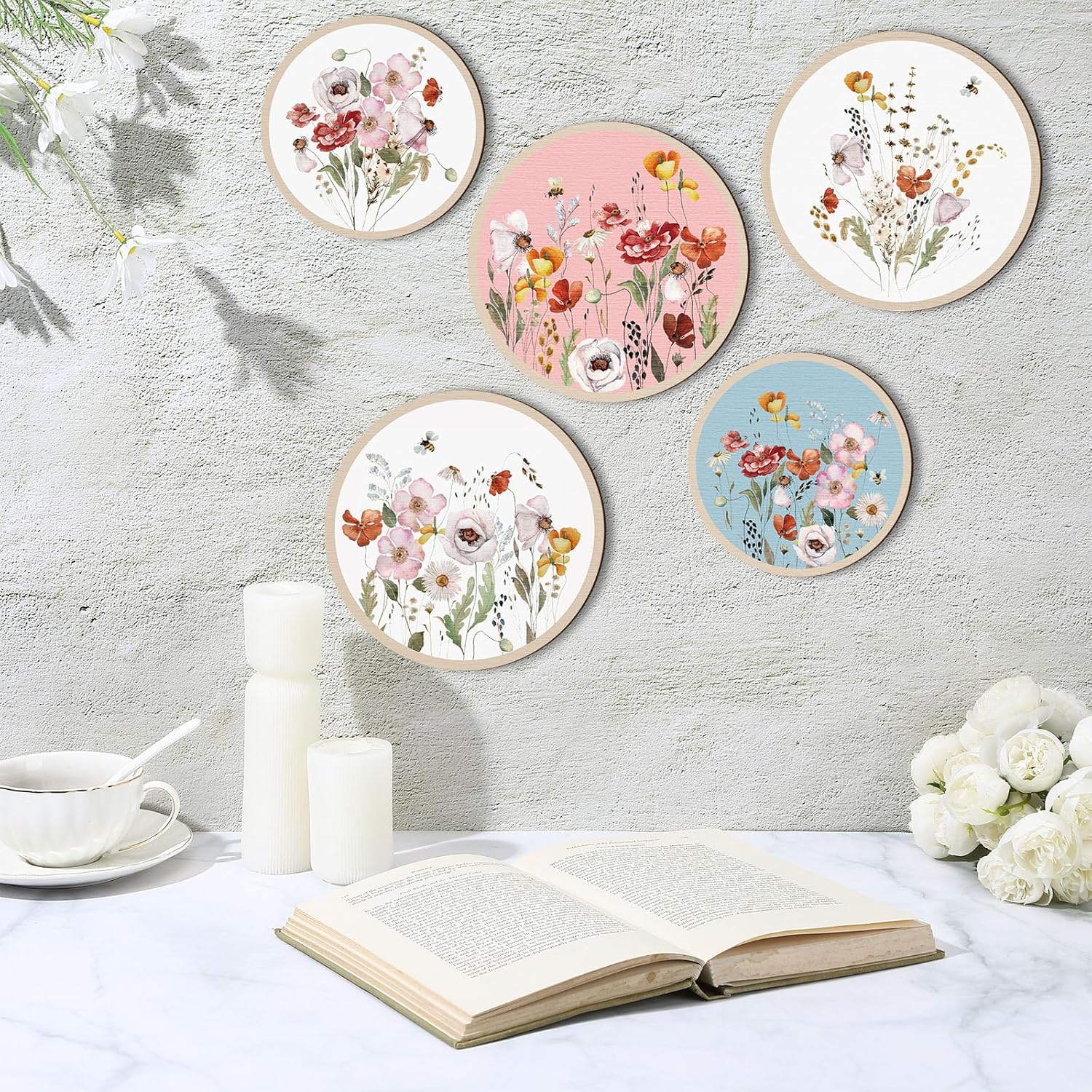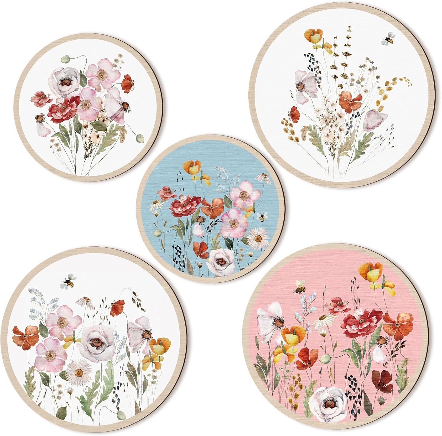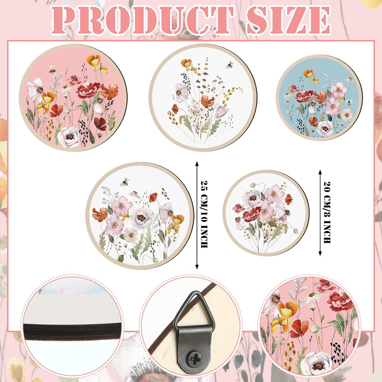 Qunclay 5 Pcs Wall Art Decor Wooden Living Room Wall Decor Bohemian Hanging Farmhouse Geometric 10'' and 8'' Aesthetic Wood Minimalist Posters for Bedroom(Wild Flower)