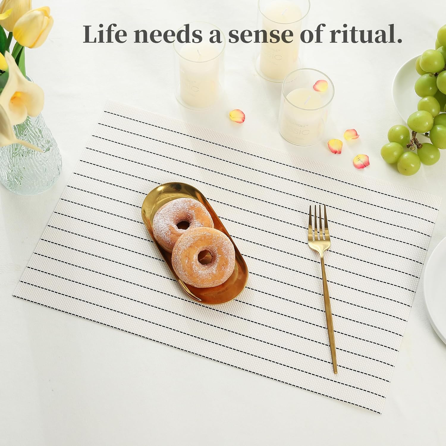 Leetaltree White with Black Stripes Placemats Set of 12 - Heat Resistant Non-Slip Place mats for Dining Table, Washable Durable PVC Vinyl Woven Table Mats(White Stripes, 12)
