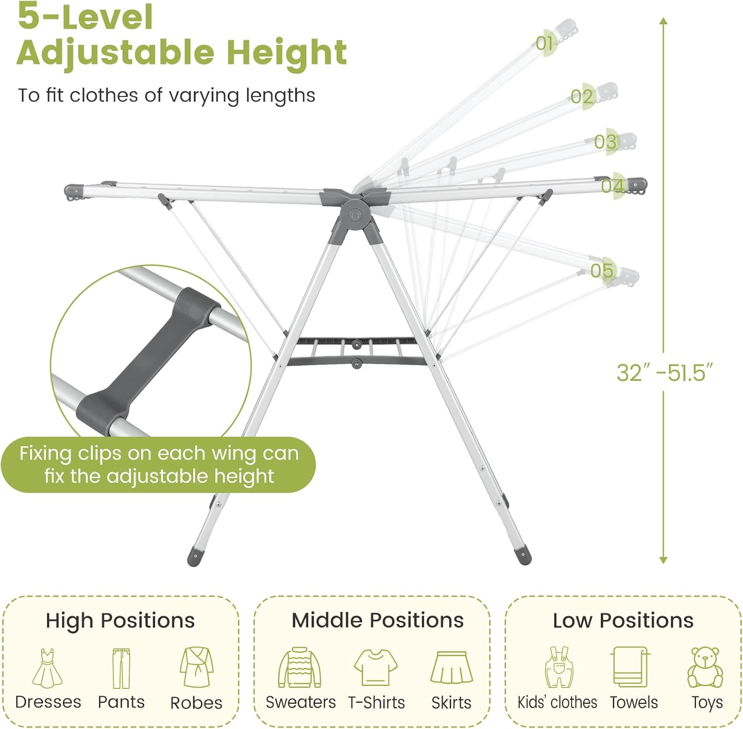 - [5-Level Adjustable Height]: Equipped with 2 height adjustable wings, this laundry hanger can be adjusted to 5 heights (32โ-51.5โ) to fit clothes of varying lengths. Plus, the fixing clips on each wing can fix the adjustable height.