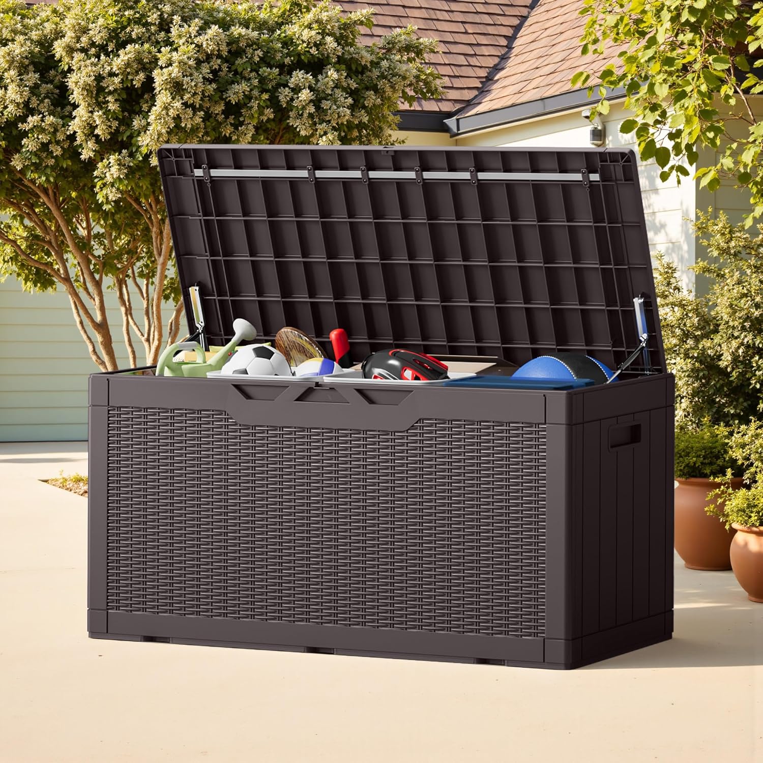 - WIDE VERSATILITY: The 100 gallon storage box can not only help you organize your patio or lawn. It can also be used as a table or bench when you need it, and the lid is equipped with a support bar inside, which can greatly enhance the stability and weight-bearing capacity of the storage box.