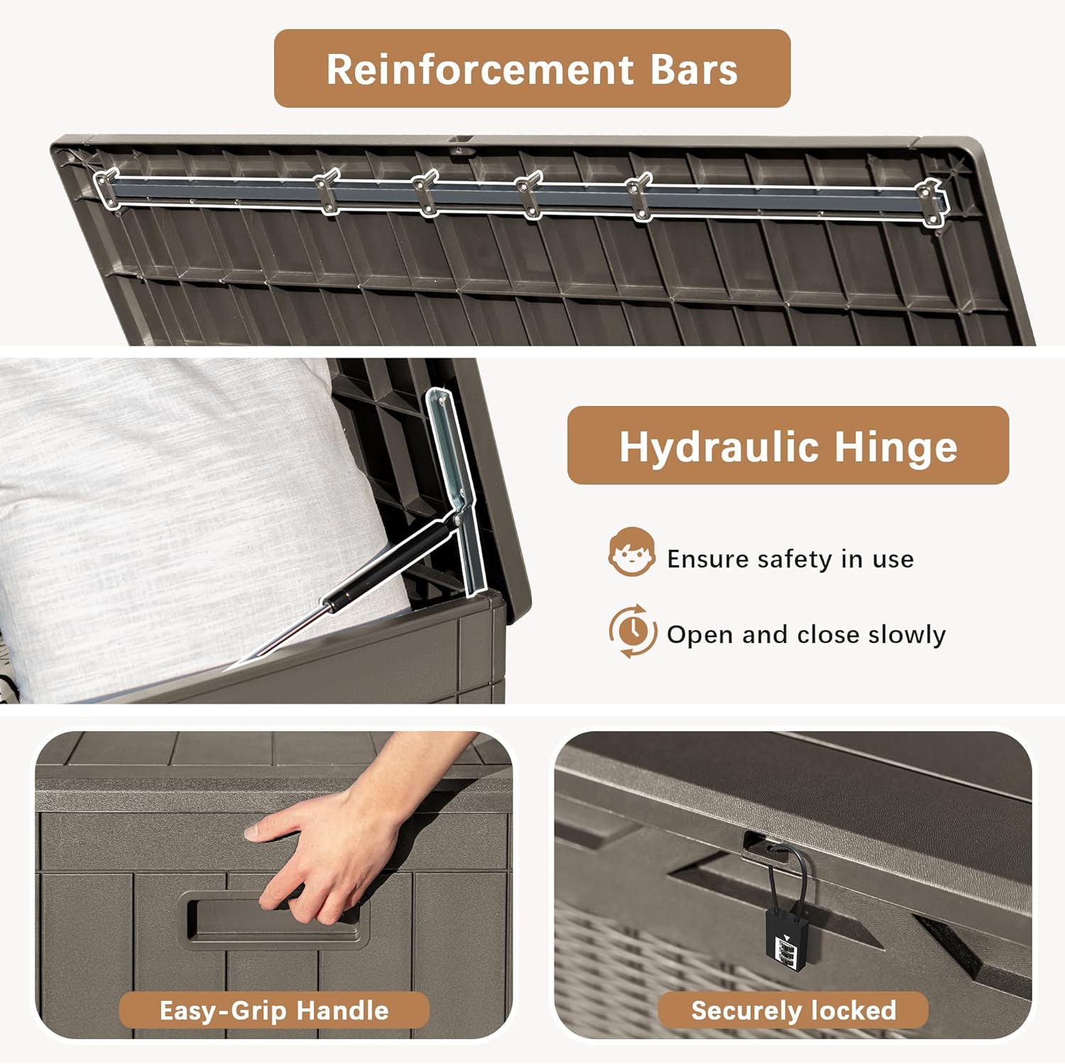 - Resistant Resin Material: Deck box is made of waterproof resin, with a complementing rattan pattern design, effectively preventing fading and rusting, while also maintaining a fresh appearance even with all-weather use