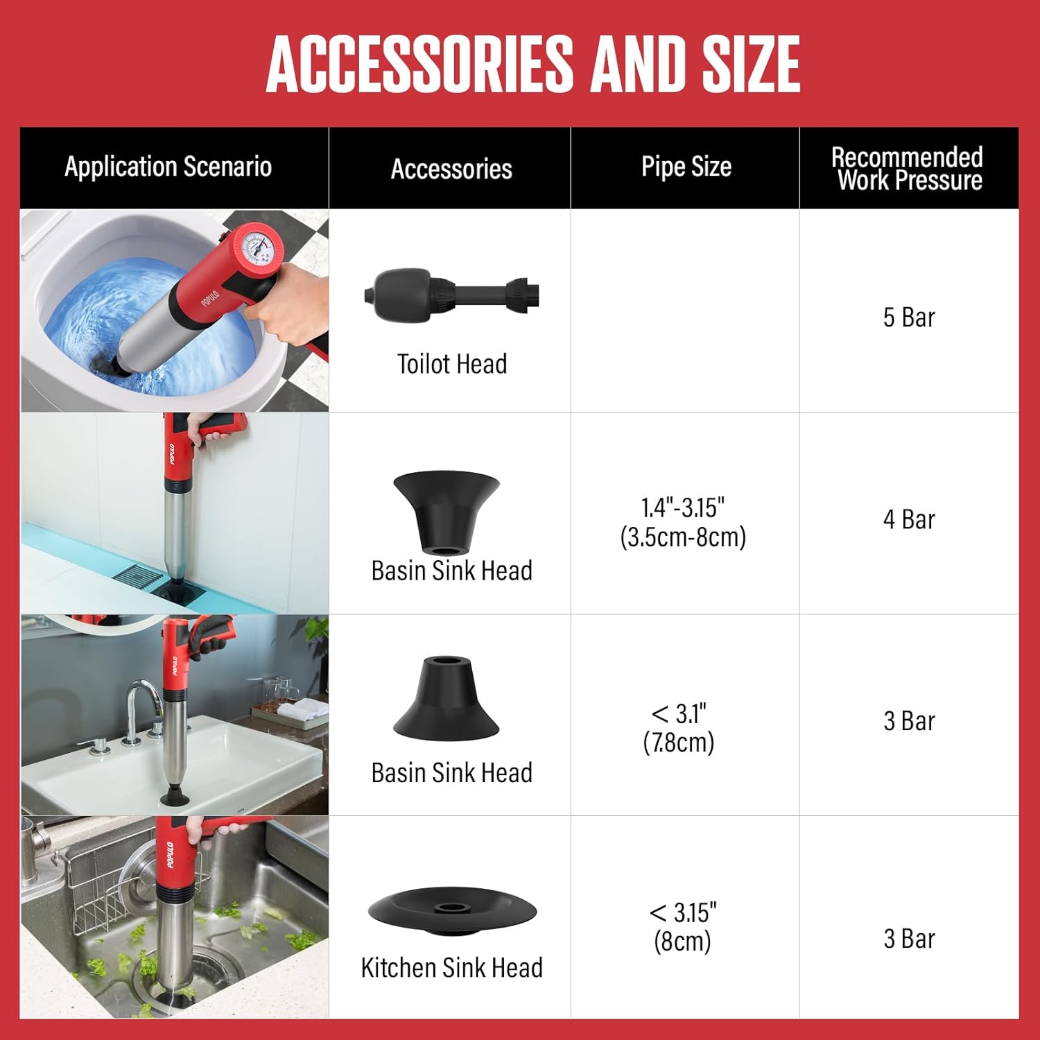 - Electric Air Pump for Enhanced Pressure: Our air pressure unclogger features a built-in electric air pump that inflates the device at the push of a button, reaching 5 Bar in just 20-30 seconds. Say goodbye to the hassle and effort of manual pumping! This is especially beneficial for tackling stubborn clogs that require multiple attempts, delivering exceptional performance when you need it most. Experience the convenience and efficiency of our product, designed to make your unclogging tasks easier than ever!