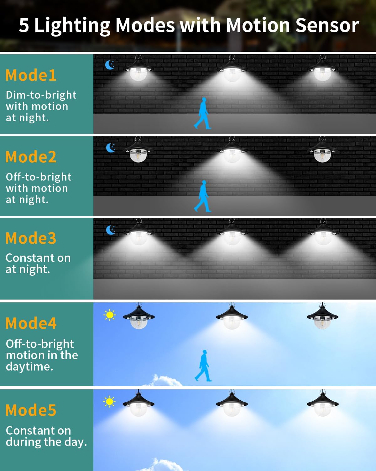 - 3 Night Modes & 3 Sensor Time Options: This solar light comes with 3 night working modes. Mode 1: Stay dim, brighten for 15s when motion is detected. Mode 2: Stay off, hight light for 15s when motion is detected. Mode 3: Always on at night. This solar garage light also has 3 induction times (25s/35s/45s) to choose from to meet your different induction time needs.