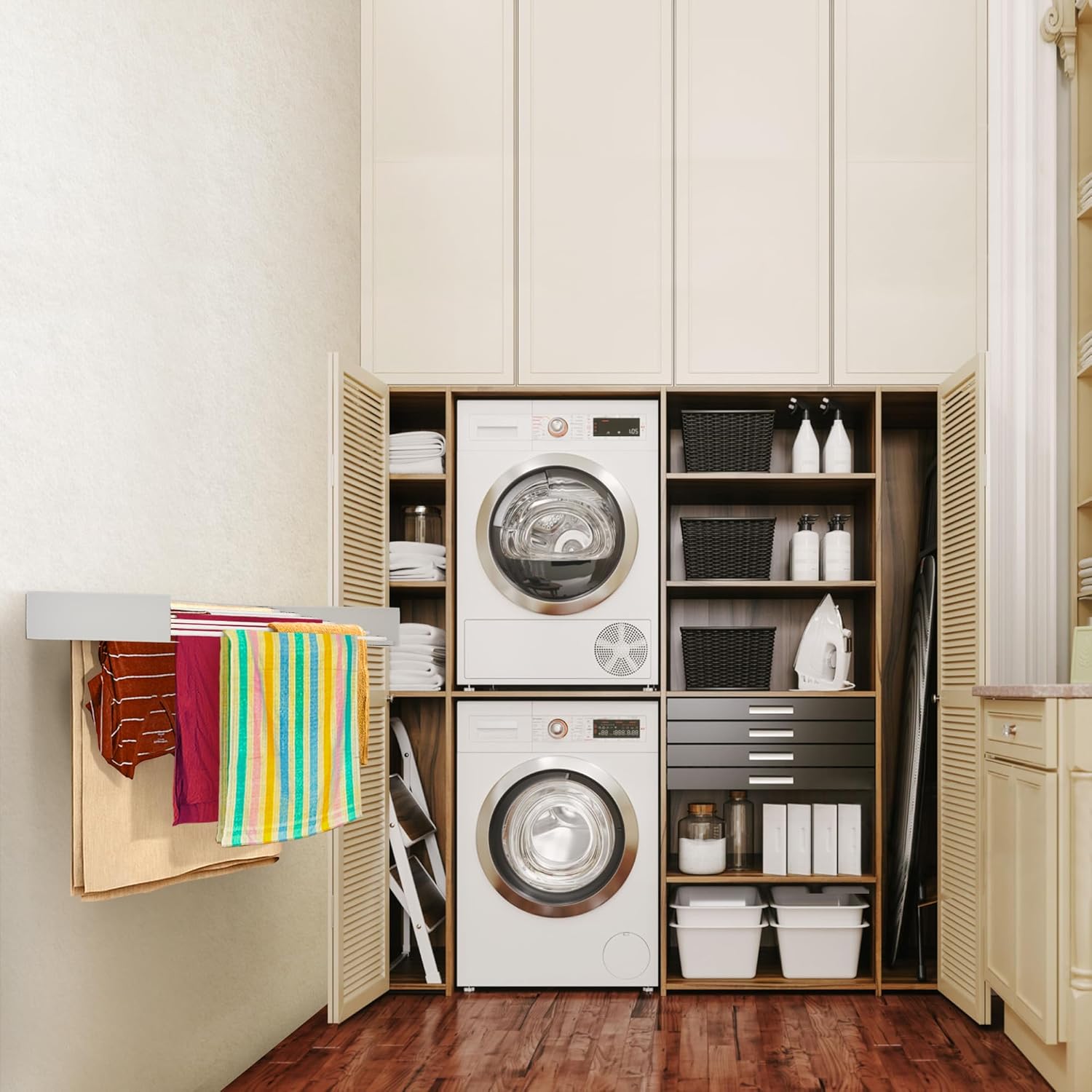 - ORIGINAL PATENTED DESIGN: Beware of the copy-cats with poor material and design. Only Step Up laundry drying rack comes with a wall template, long screwdriver bit, and holes designed to perfectly fit on the studs.
