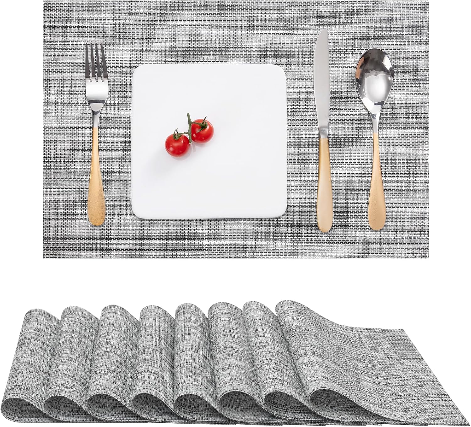Myir JUN Placemats Set of 8, Vinyl Woven Placemats Place Mats Indoor Set of 8 Washable Table Mats Non-Slip Place mats for Dining Table (Light Gray, Set of 8)