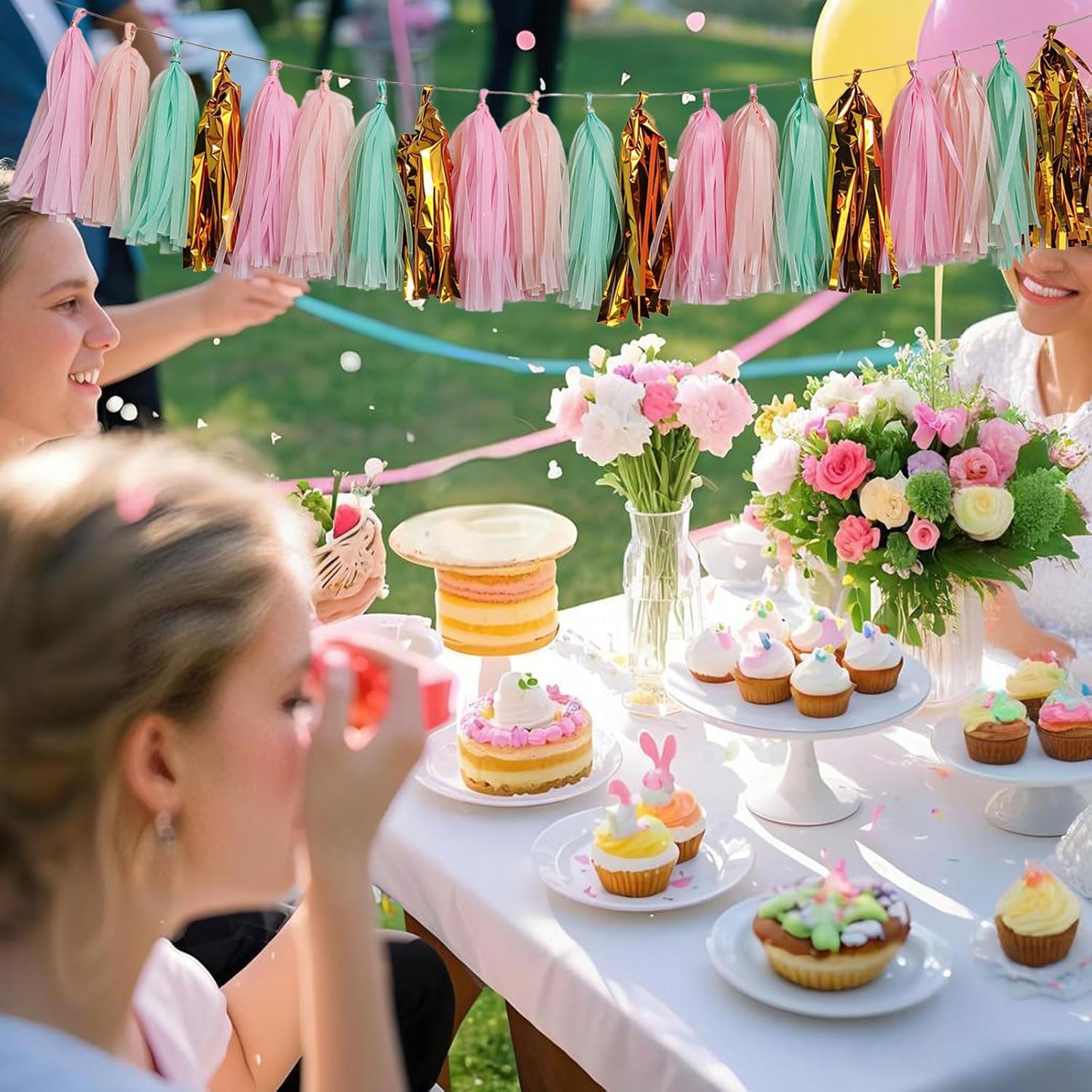- Package includes: 20 tassels (Gold,Mint,Peach,Pink).5 pcs per color. Each tassel is about 12" long after assembled. And each garland comes with a 10ft long String for hanging these tassels