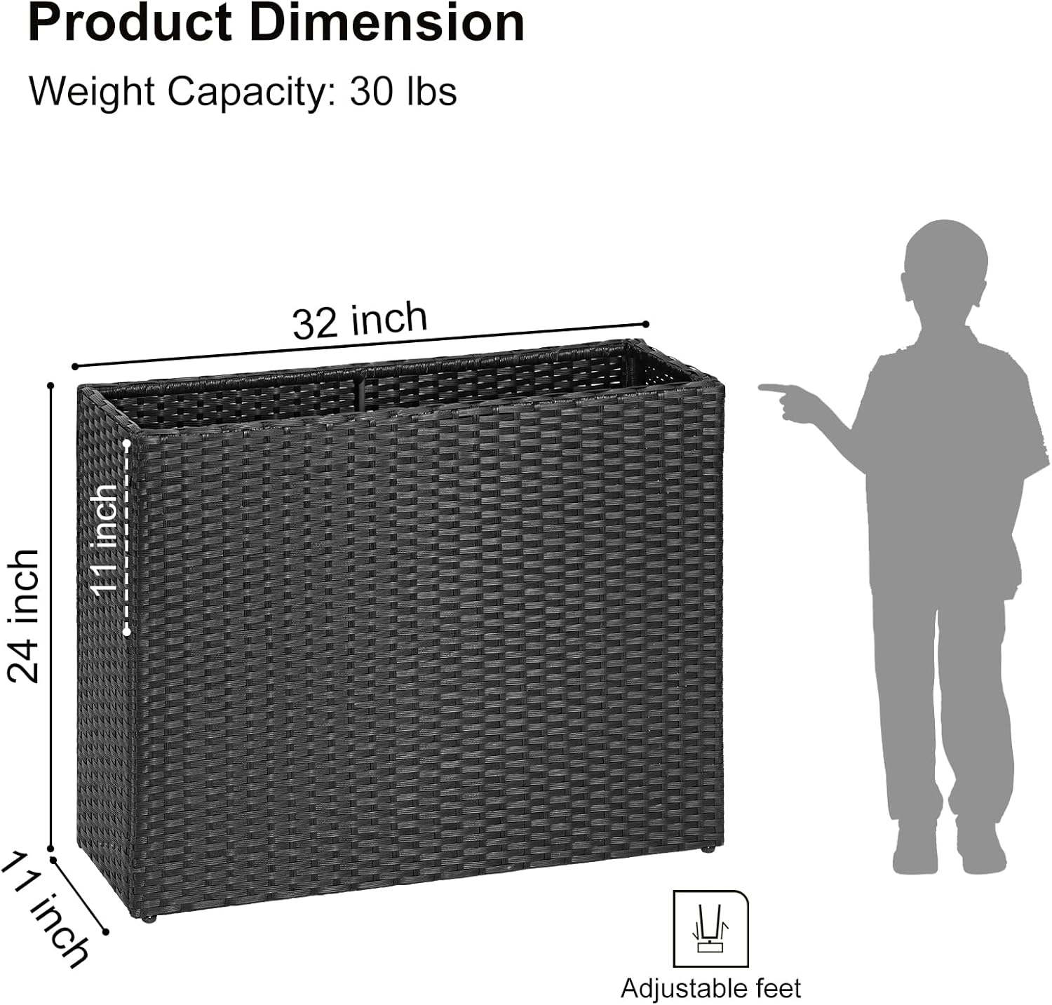 - Product Details - Dimensions (LxWxH) Plant pot: 32 x 11 x 24 inch Material: PE rattan, Powder-coated Steel, Plastic , Adjustable Feet