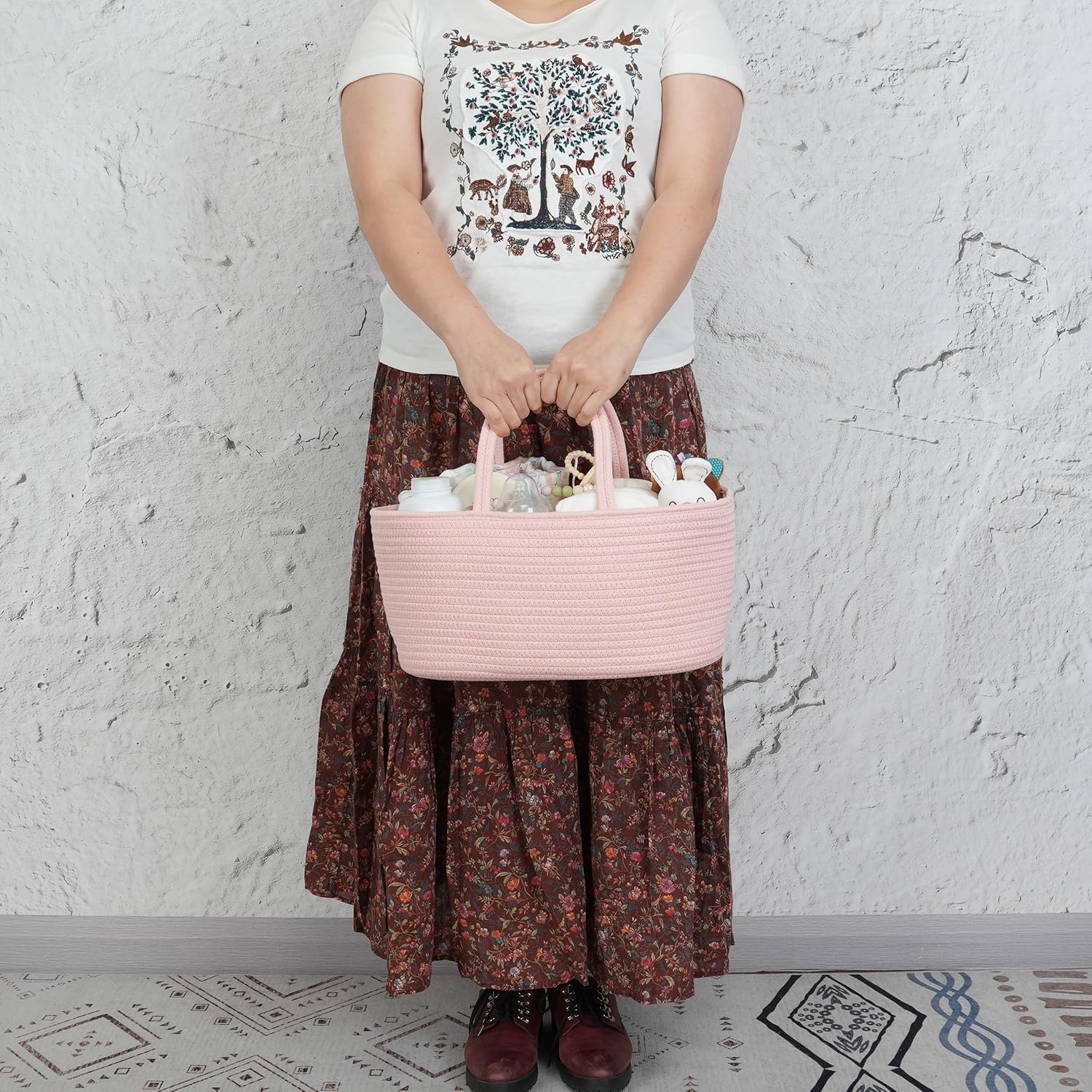 Diaper Caddy Organizer Cotton Rope Baby Basket Nursery Storage and Portable Tote Bag for Car Ideal Baby Shower Gifts and Registry Must-Have for Newborn Essentials coral pink