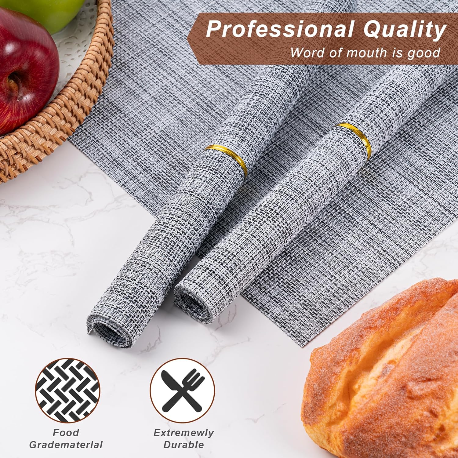 - Protect Your Table:Our placemats protect your table from scratches and spills while adding style. Heat-resistant up to 176°F (80°C), they also keep your food warm. With high-quality woven vinyl construction, they resist stains and water for daily use. Elevate your dining experience with these elegant and durable mats.