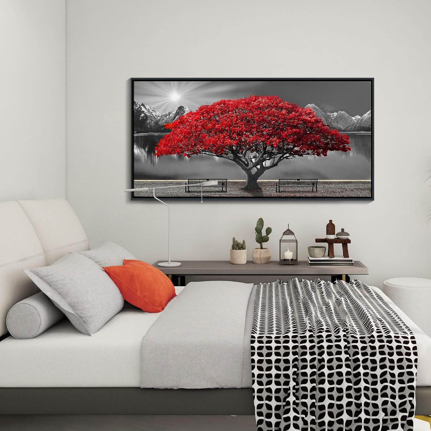 Framed Black and White Red Tree Wall Art Canvas Print Picture Large Red Tree Landscape Modern Artwork for Living Room Bedroom Office Home Wall Decor With 24X48inch