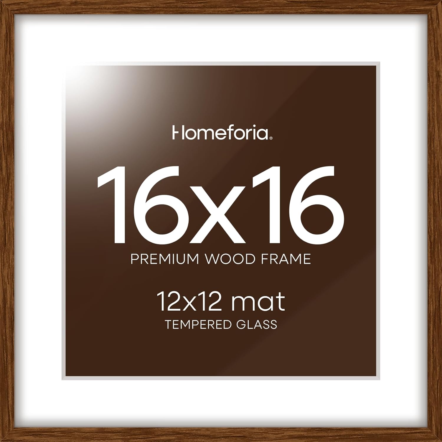 Homeforia 16x16 Brown Picture Frame, High End Dark Oak 16 x 16 Square Wood Frame with Mat 12 x 12 for Photo, 16by16 Wooden Walnut Poster Frame Matted to 12x12 Print, Tempered Glass, Wall Kit, Set of 1