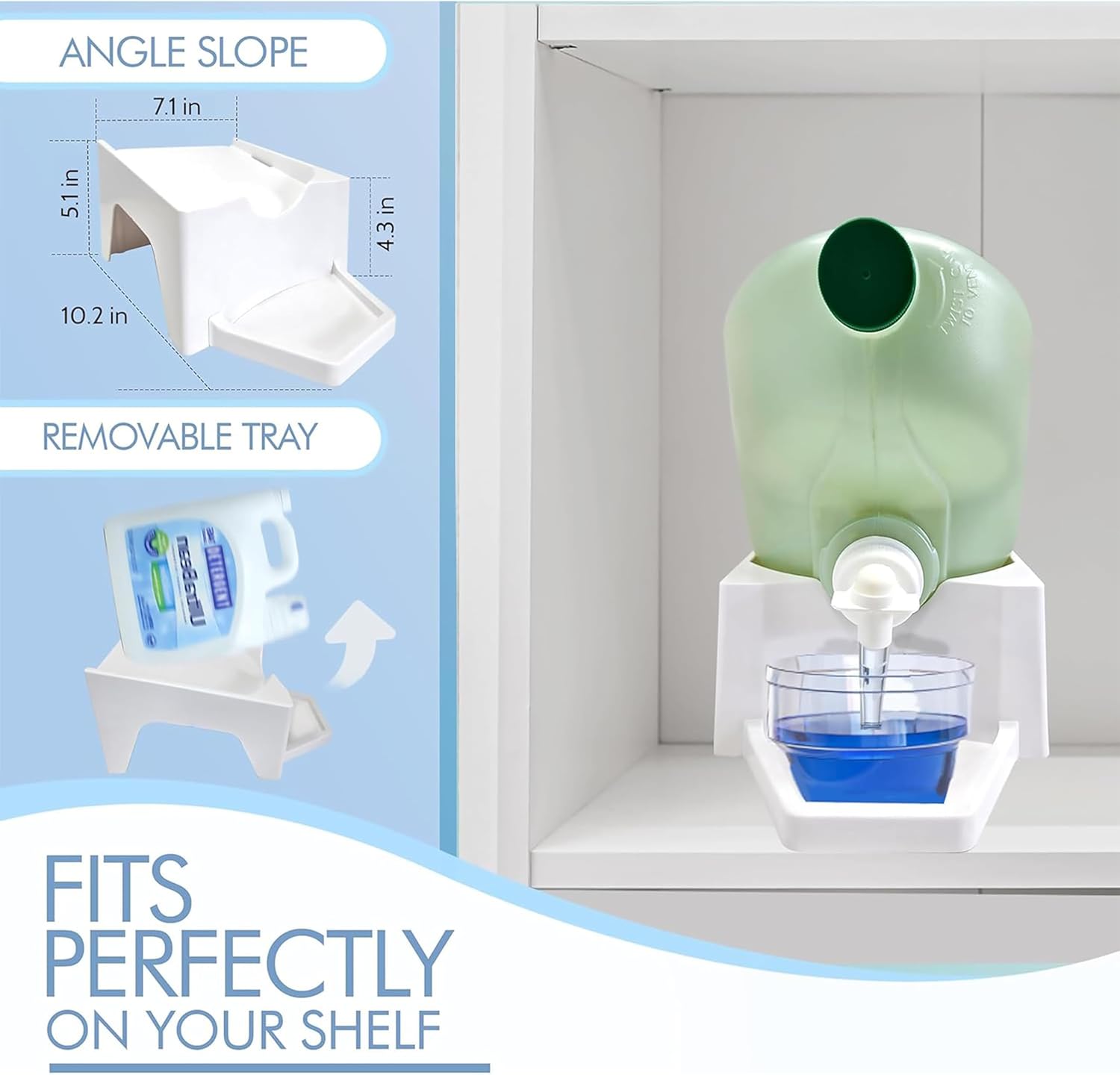 - [No more messy Shelves]: The molded edge of this laundry detergent dispenser holder, holds your measuring cup securely, preventing soap drips and messes from spilling onto your shelves or floors, keeping your laundry area clean.