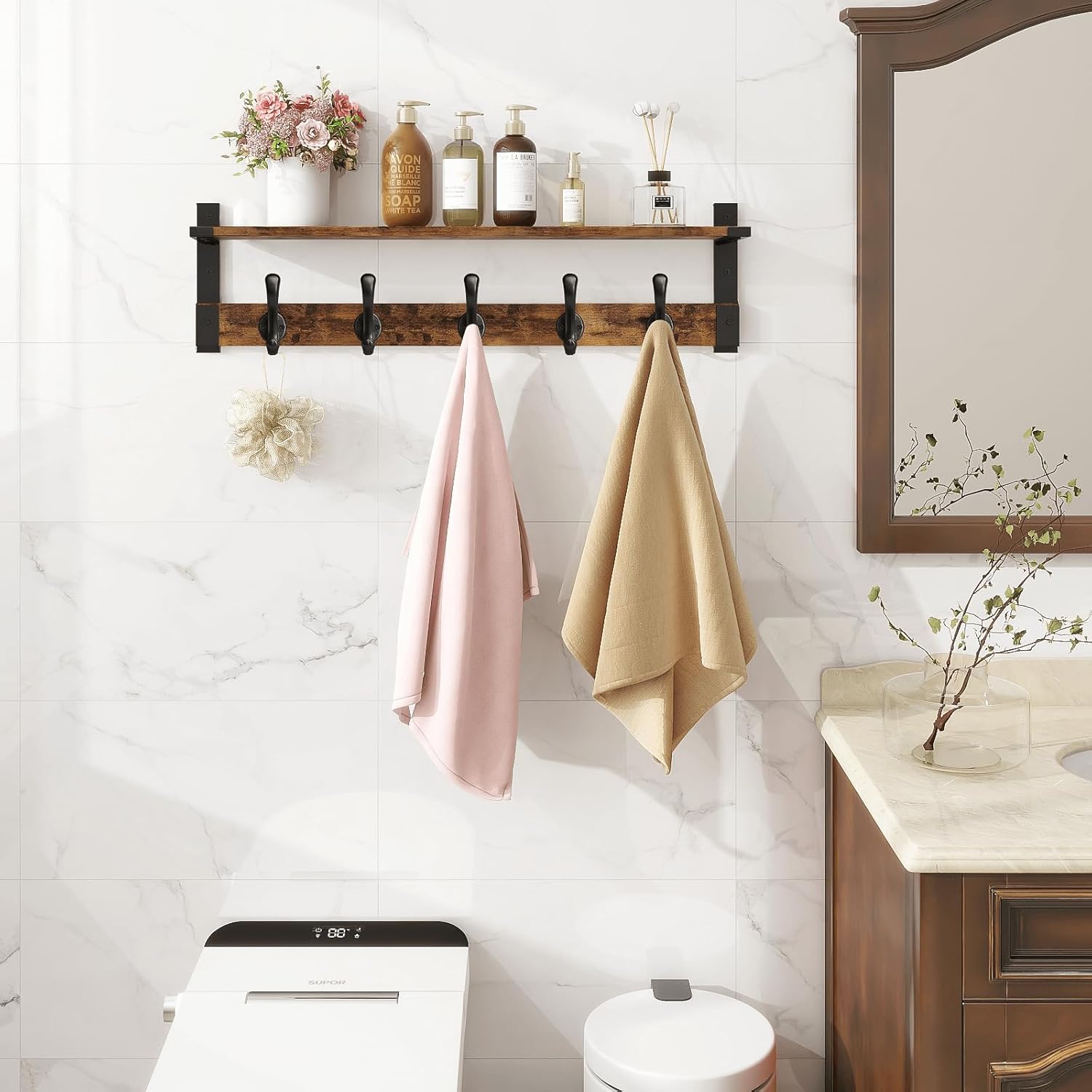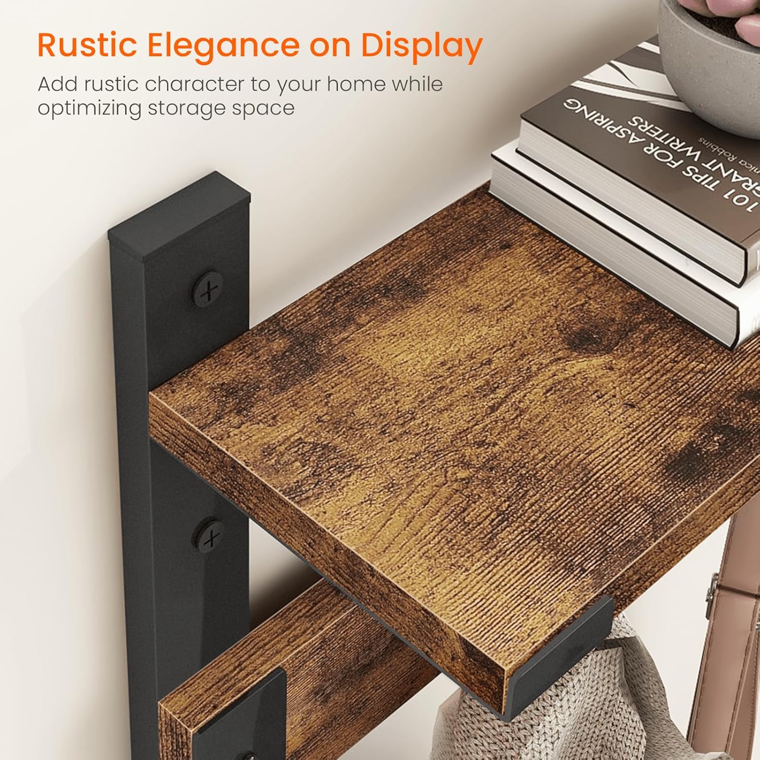 Homode Coat Rack Wall Mount, 29 Inch Long Shelf with Hooks, Wood Entryway Shelf with 5 Hangers for Hanging Hat Jacket Backpack Purse, Rustic Brown Black