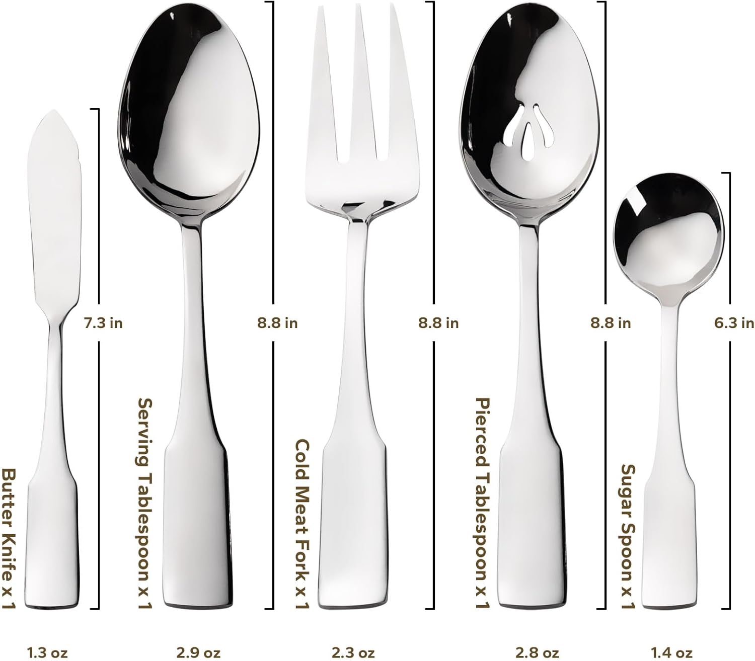- INCLUDES: 65-piece flatware set with service for 12. Includes 12 each: dinner knife, dinner fork, salad fork, dinner spoon and teaspoon. Plus 1 eachοΌserving tablespoon, pierced tablespoon, cold meat fork, butter knife, and sugar spoon