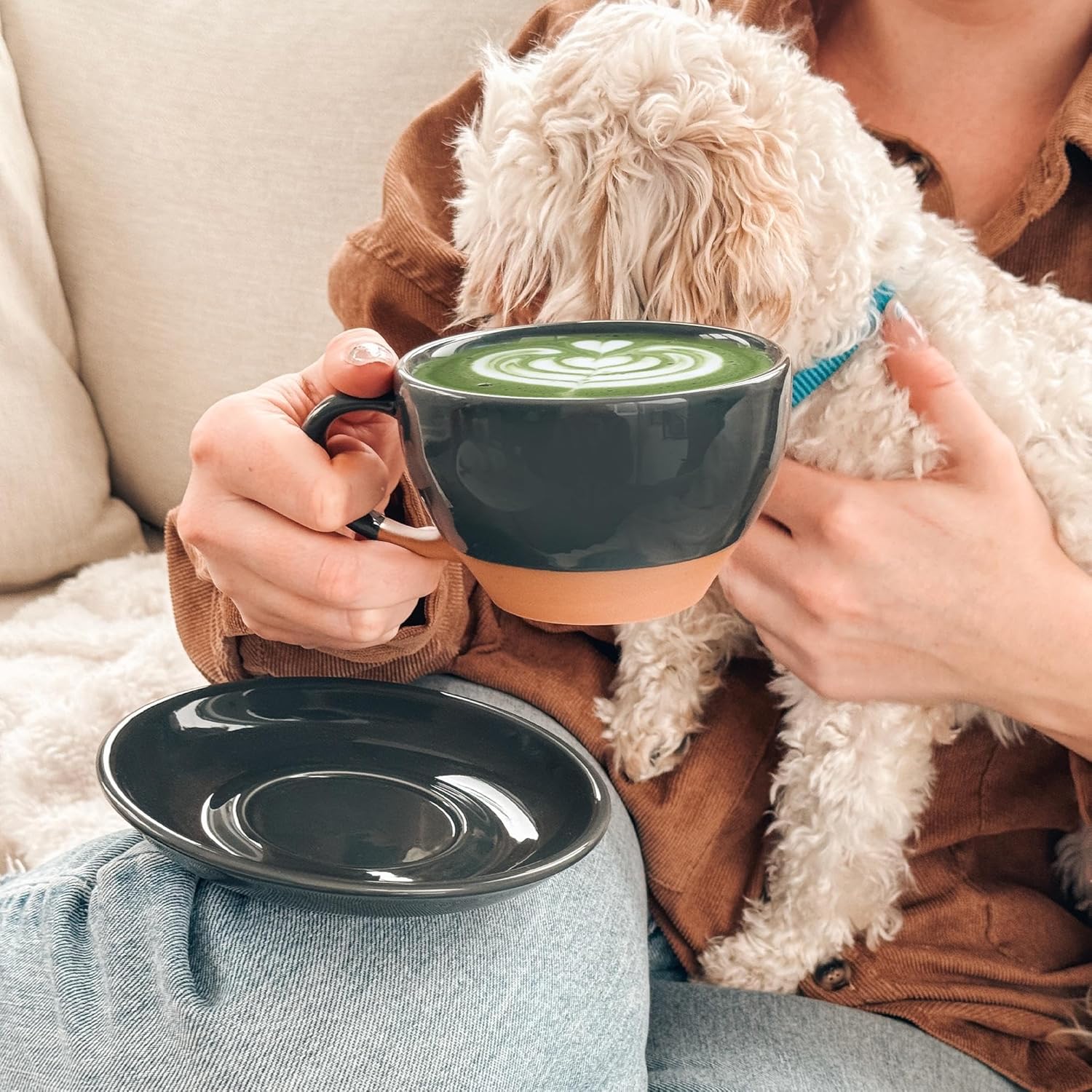 Mora Ceramic Latte Art Mug With Saucer - 10.5 oz, Round Bottom For Perfect Pours - Cafe Cups for Cappuccino, Espresso, Coffee, Tea etc - Porcelain Set for Baristas, Great Gift - Charcoal