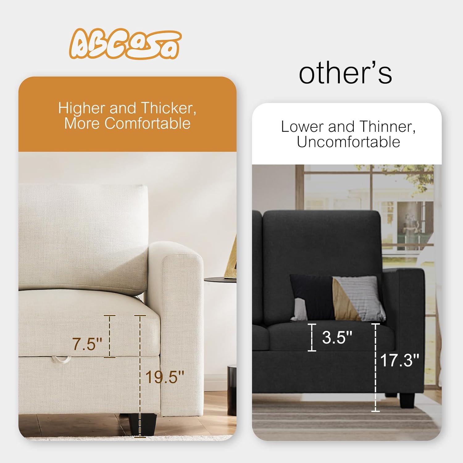 - THICKER CUSHION & COMFORTABLE FABRICS:The thickness for seat cushion is 7.5 inches. The inside is made of high-quality foam and spring padding, providing both support and comfort. The outside is made of imitation linen, which is skin-friendly, breathable, and resistant to pilling and fraying. Seat firmness: medium. On a scale from 1 to 5 (5 being the firmest), it's a 3.