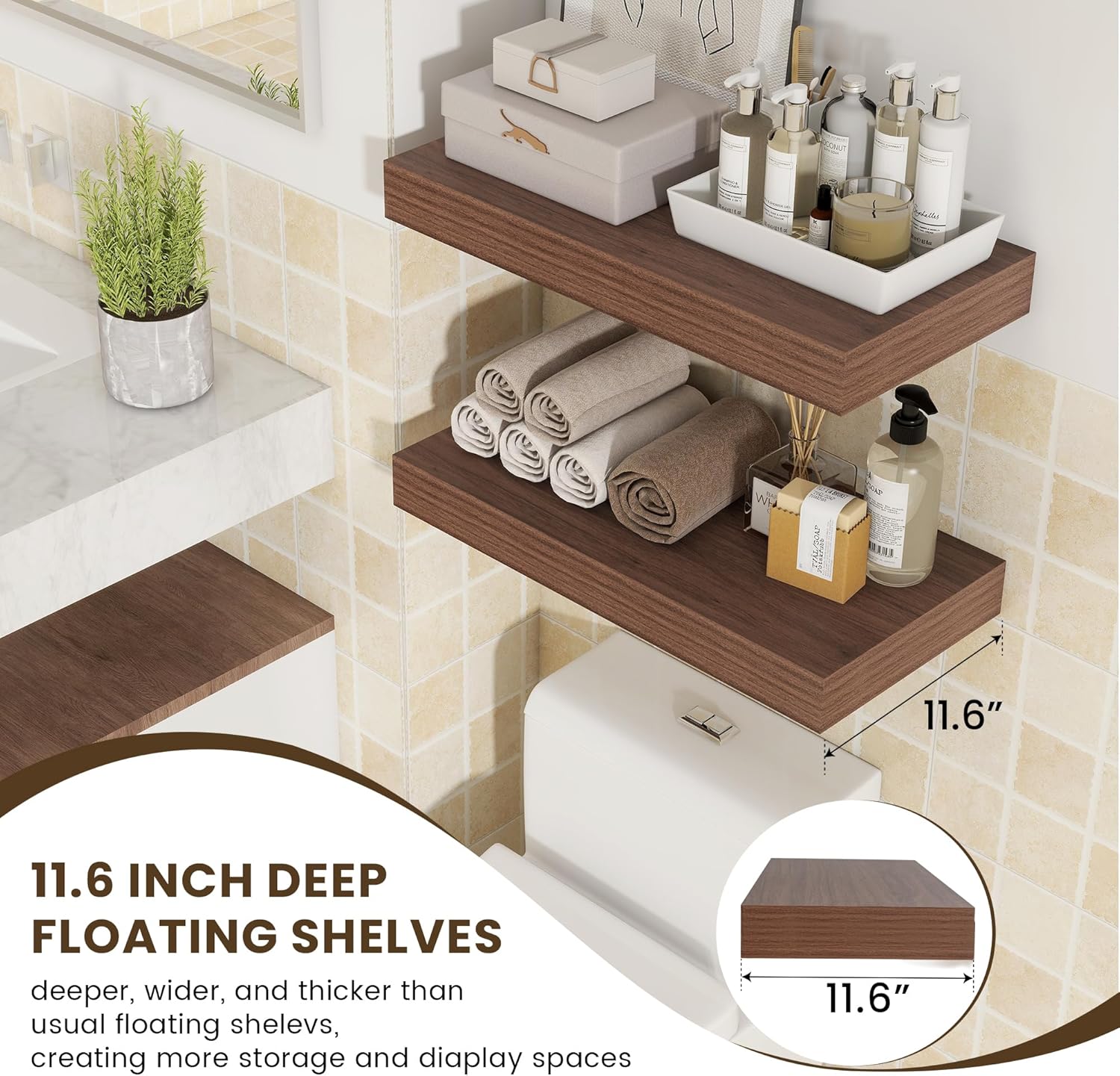 - DEEPER & THICKER SHELF - Our floating shelves measure 24W x 11.6D x 2H, deeper and thicker than usual wall shelves, which create more storage and display space for your home