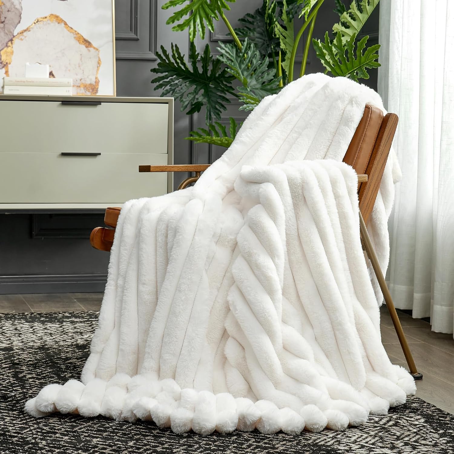 Cozy Bliss Faux Fur Throw Blanket for Couch, Cozy Warm Plush Striped Blanket for Sofa Bedroom Living Room, 60 * 80 Inches Cream White