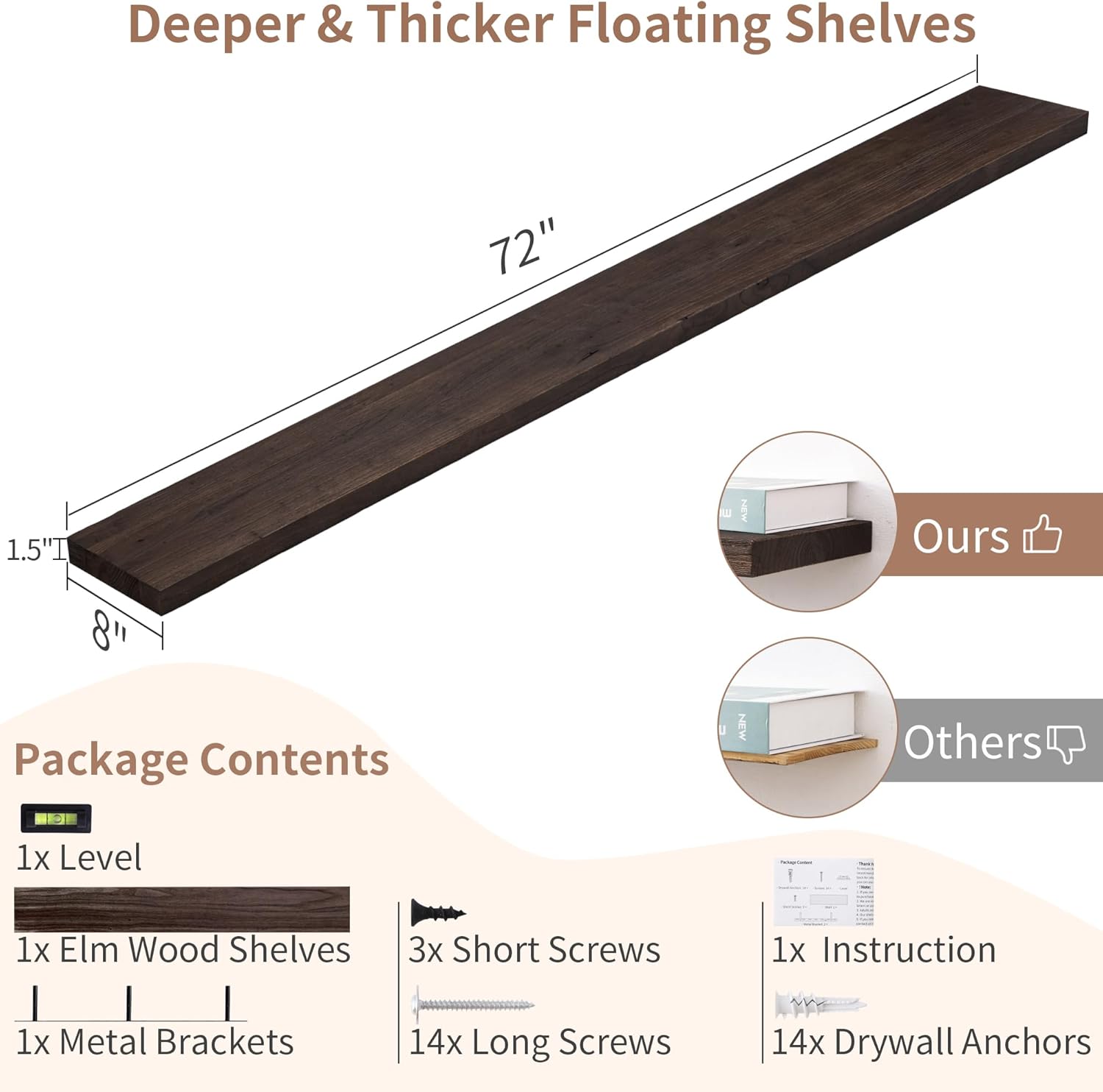 - EASY TO ASSEMBLE: We provide all the necessary hardware and a detailed installation guide, making it easy to install the shelves within 10 minutes. If you have any questions or concerns, our customer service team is always available to help. Enhance your home decor with our stylish and functional solid elm wood shelves today!