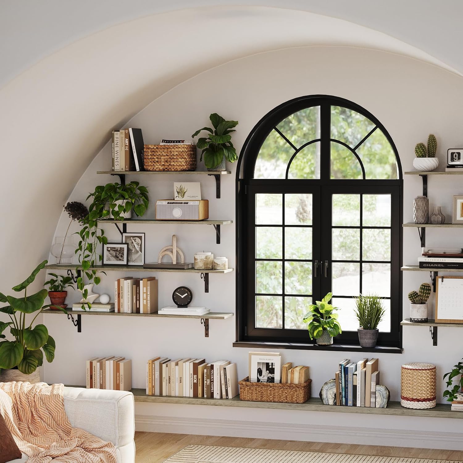 - ใAdd Finishing Touch to SpaceใMid-century design adds a retro-chic vibe to your home. Rusticity wood grain and exquisite S-shaped iron brackets flaunt visual interest and romance. They are full of character and enhance the texture of the space. A classy way to display your beloved decorations