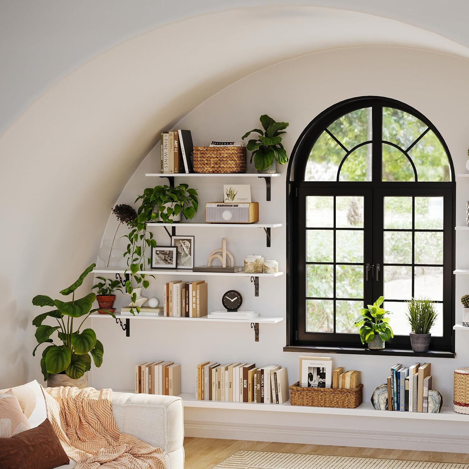 - ใAdd Finishing Touch to SpaceใMid-century design adds a retro-chic vibe to your home. Rusticity wood grain and exquisite S-shaped iron brackets flaunt visual interest and romance. They are full of character and enhance the texture of the space. A classy way to display your beloved decorations