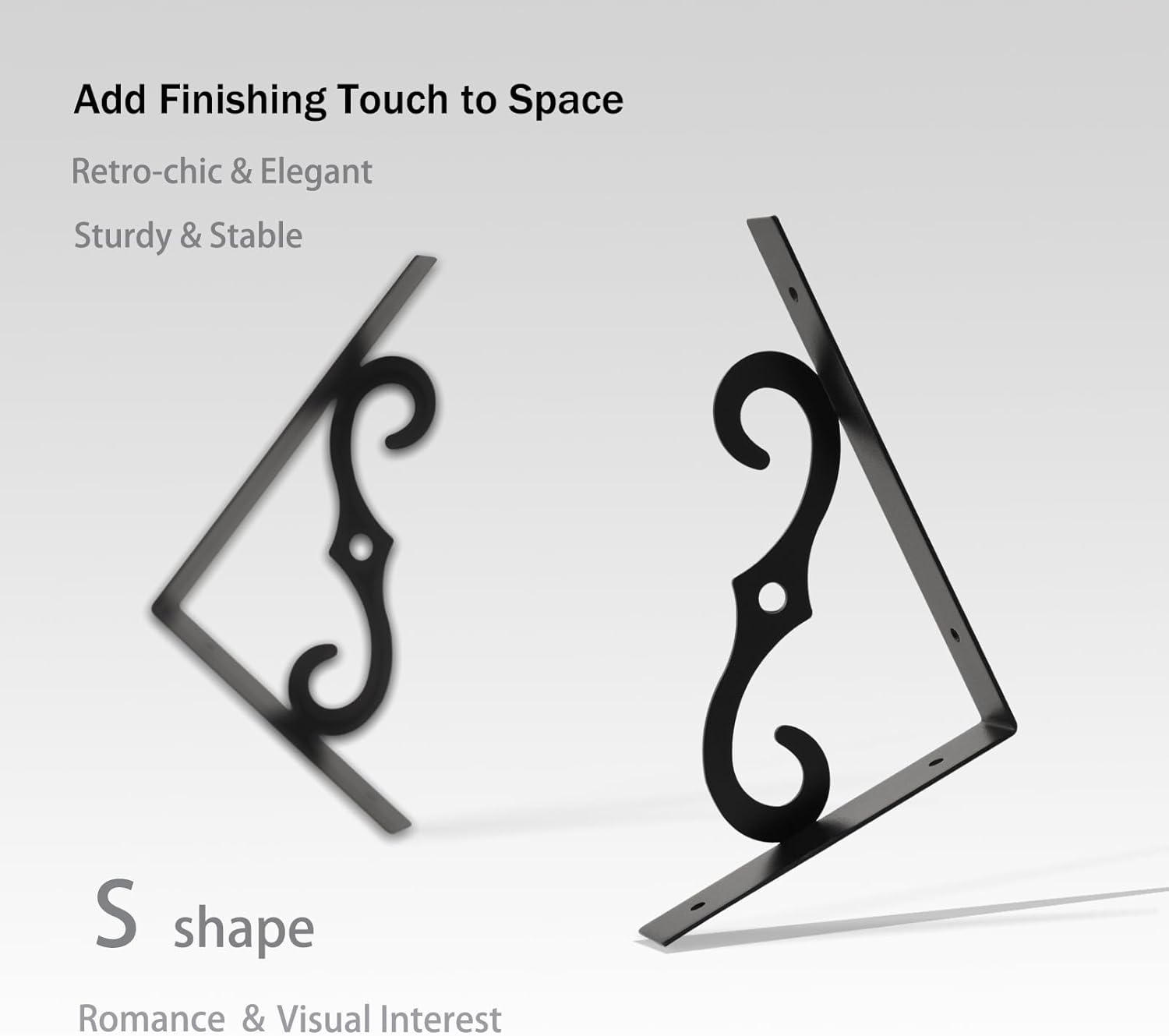 - ใAdd Finishing Touch to SpaceใMid-century design adds a retro-chic vibe to your home. Rusticity wood grain and exquisite S-shaped iron brackets flaunt visual interest and romance. They are full of character and enhance the texture of the space. A classy way to display your beloved decorations