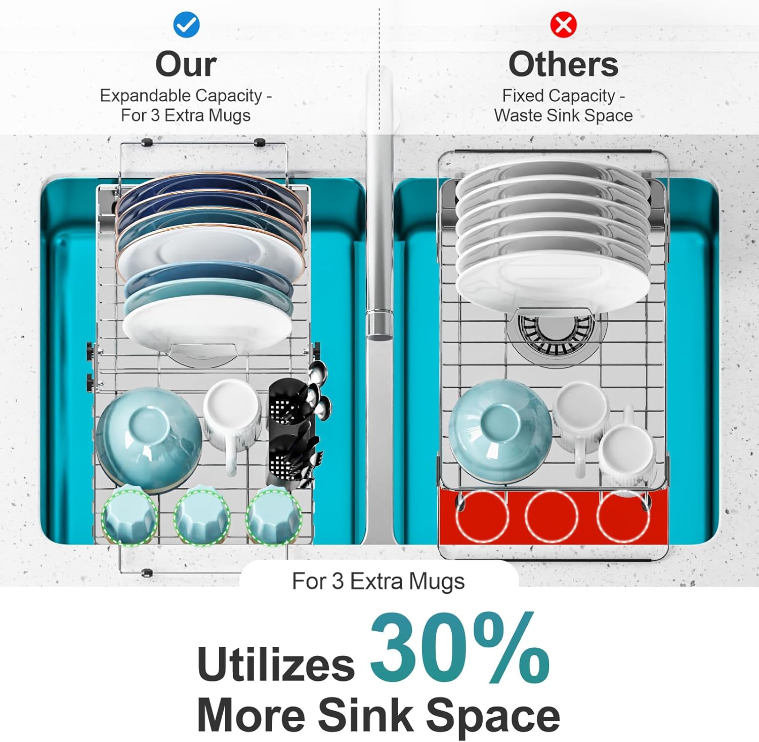 - True Expandable, Real Capacity Boost: Unlike other racks that only extend handles, our dish drainer expands as a whole unitโtruly increasing your drying space, allowing you to comfortably hold at least 3 extra cups in addition to 6 plates, bowls, utensils, and even fresh fruits and veggies. This innovative design not only ensures perfect sink compatibility but genuinely maximizes your drying area
