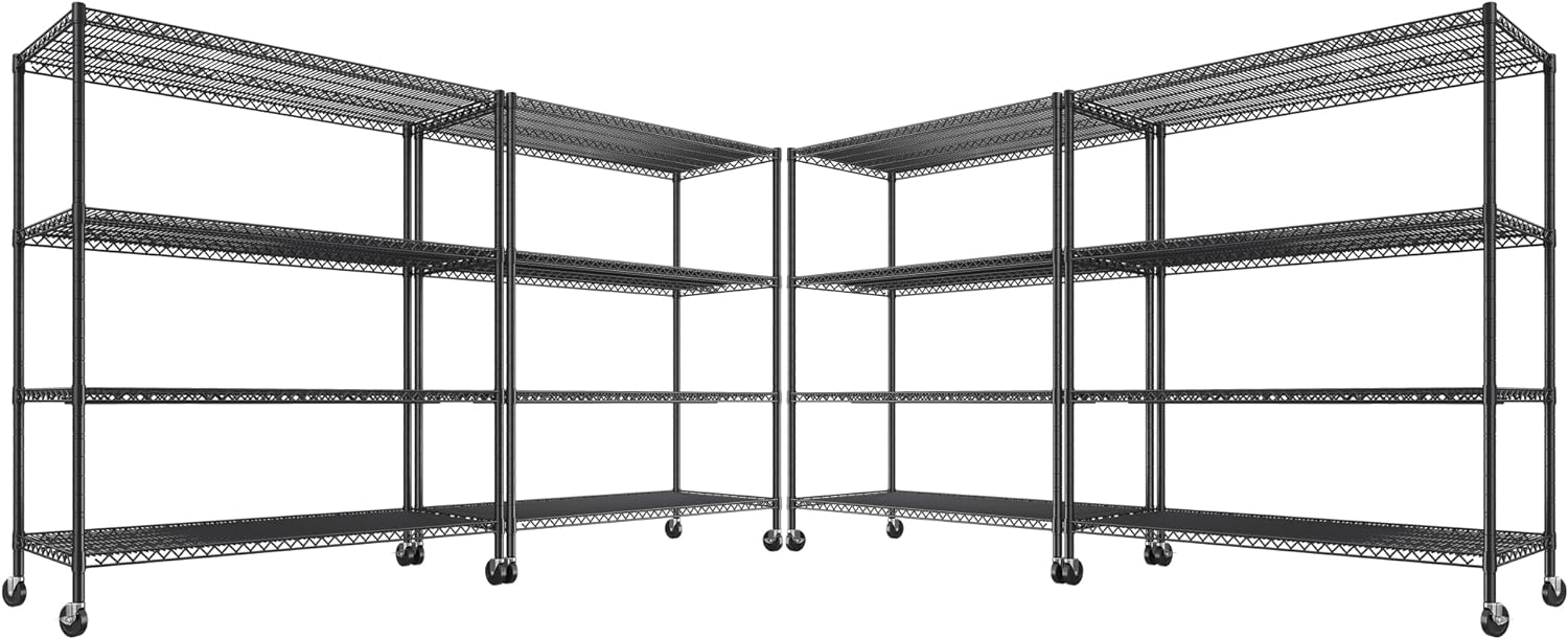- γLarge Storage Space Wide Metal ShelvesγThe size of wire shelf storage rack on wheels is 75.6"H X 55.5"W X 24"D. The capacity of wire shelving is twice that of the market shelves, easily meeting your storage needs.The 4 tier metal shelf unit not only expands your storage space, makes your home clean and orderly, is your best choice.The metal storage rack can be placed in kitchens, bathrooms, rooms, living rooms, warehouses, offices, commercial exhibitions, hotels, supermarkets, etc;
