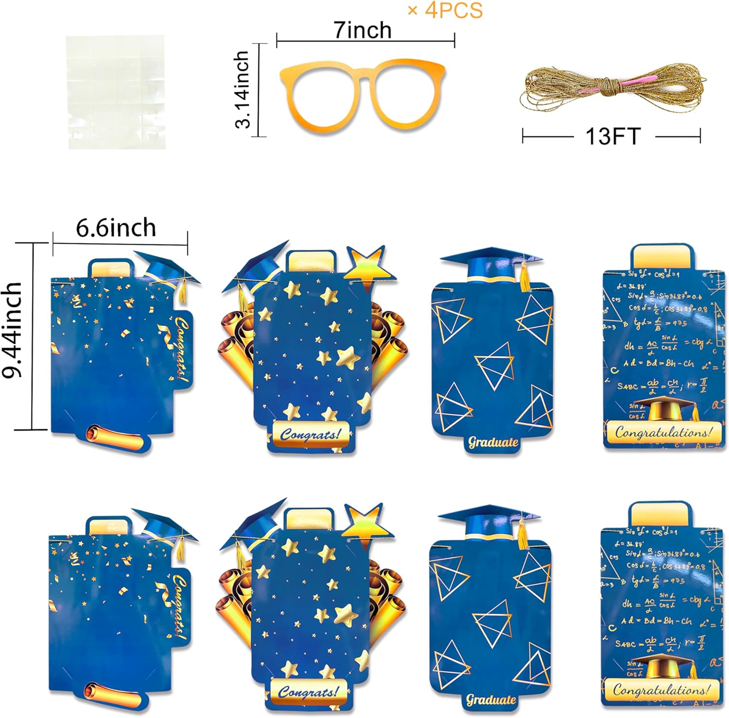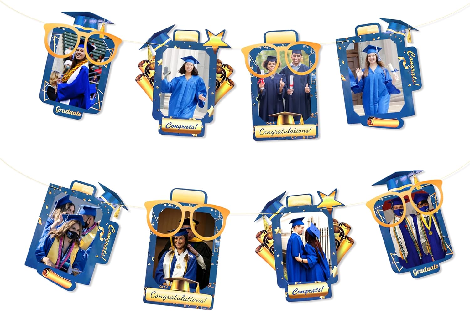 - Package Contains - Each set include 8 pcs navy blue gold paper graduation theme photo frames and 4 pcs of paper gold glasses,comes with 13ft long gold threads for hanging.1 pcs plastic threading needle for threading the photo banner together.20 pcs double sided adhesive dots for stick the paper glasses and smaller photos .