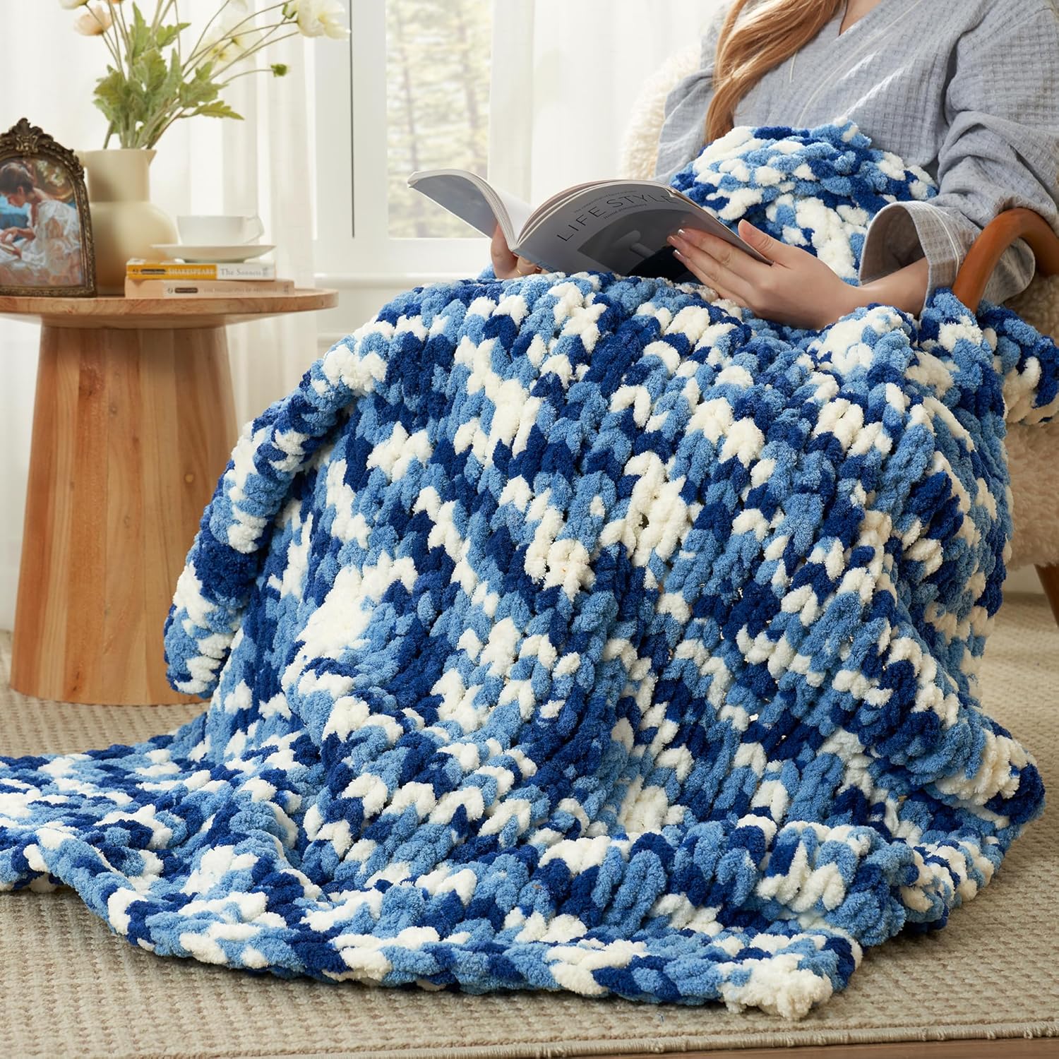 Amélie Home Chunky Knit Throw Blanket for Couch, Soft Chenille Crochet Blanket for Sofa, 50"x60", Space-Dyed Blue