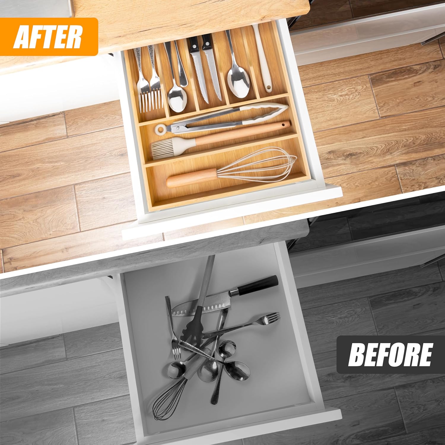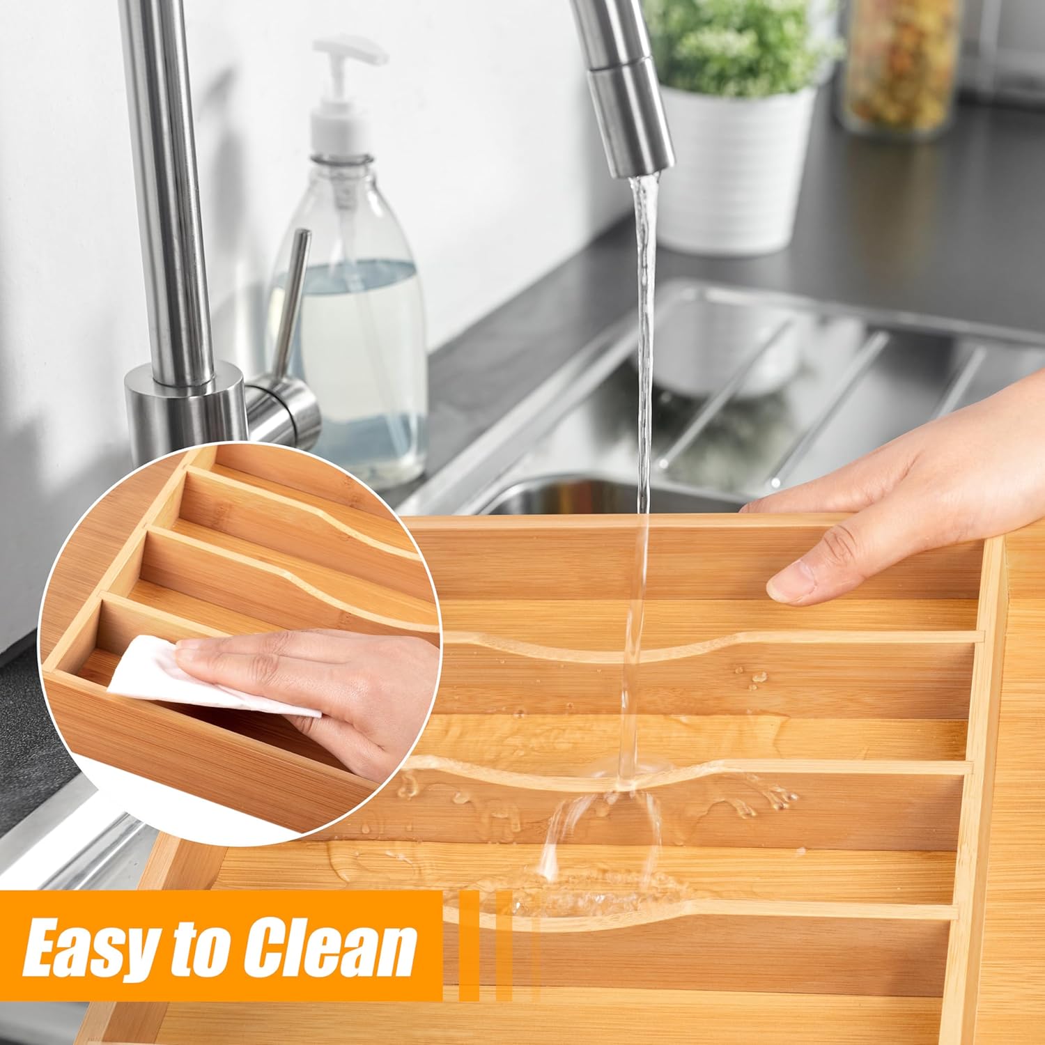 - β γPerfect premium bambooγOur utensil silverware drawer organizer flatware cutlery tray is crafted from natural bamboo that has been grown for over 4 years. Each silverware drawer organizer made of bamboo is meticulously handcrafted by seasoned artisans to ensure a smooth, splinter-free surface. You can confidently allow your family or children to use our silverware drawer organizer. Unlike plastic and metal drawer organizers, our utensil holder is water-resistant and odor-resistant, making it perfect for long-term use.