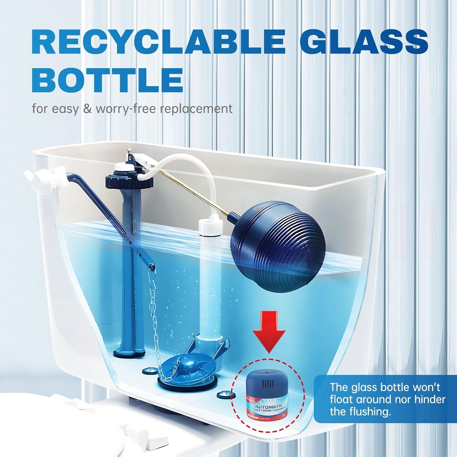 - RECYCLABLE GLASS BOTTLE: Vacplus toilet bowl cleaner comes in a weighted recyclable glass bottle that stays calmly on the bottom of the tank. The high-quality glass container won't float away in the tank and hinder the flushing devices at all. Choosing our earth-friendly toilet bowl cleaner is an easy way to cut back on single-use plastics and help the environment.