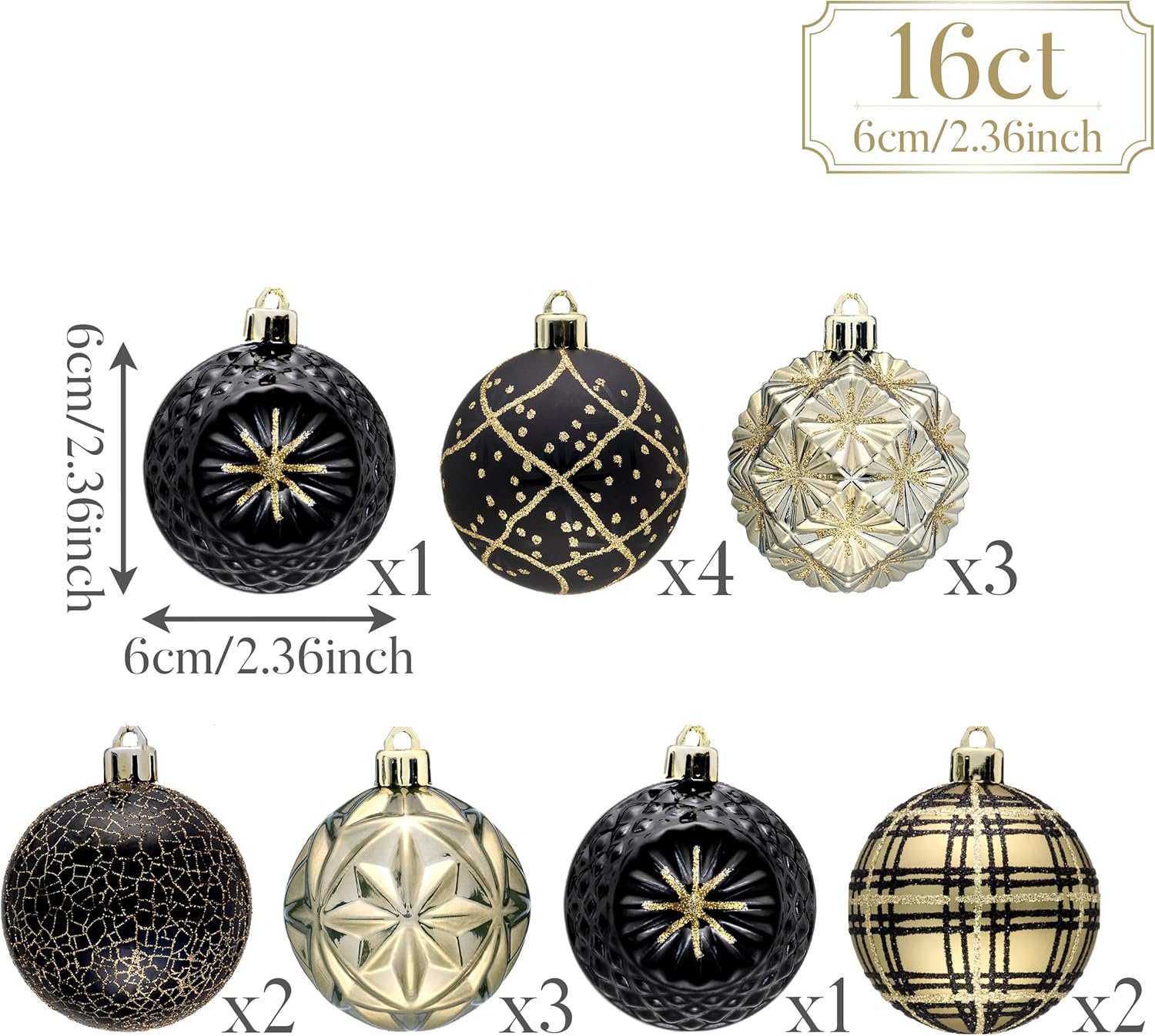 Valery Madelyn Ornaments for Christmas Trees, 16ct 2.36 Inches Black and Gold Shatterproof Christmas Tree Decorations, Luxury Hanging Ball Ornaments for Xmas Holiday Party Decor