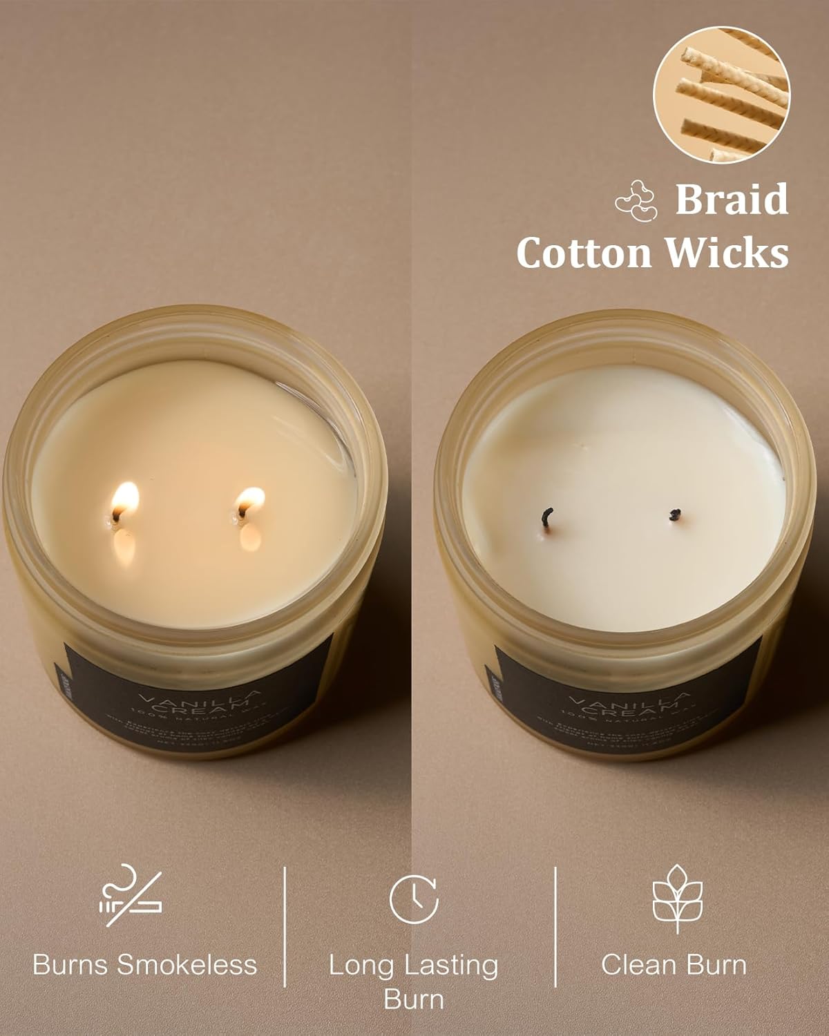 - ๐ณ Clean Consistent & Even Burn - Using 2 American made lead-free cotton wicks for a even burn result. They're cotton flat braid wicks with paper throughout, providing increased rigidity and burn more consistently than 100% cotton wicks. Designed to reduce carbon buildup which leads to black soot.